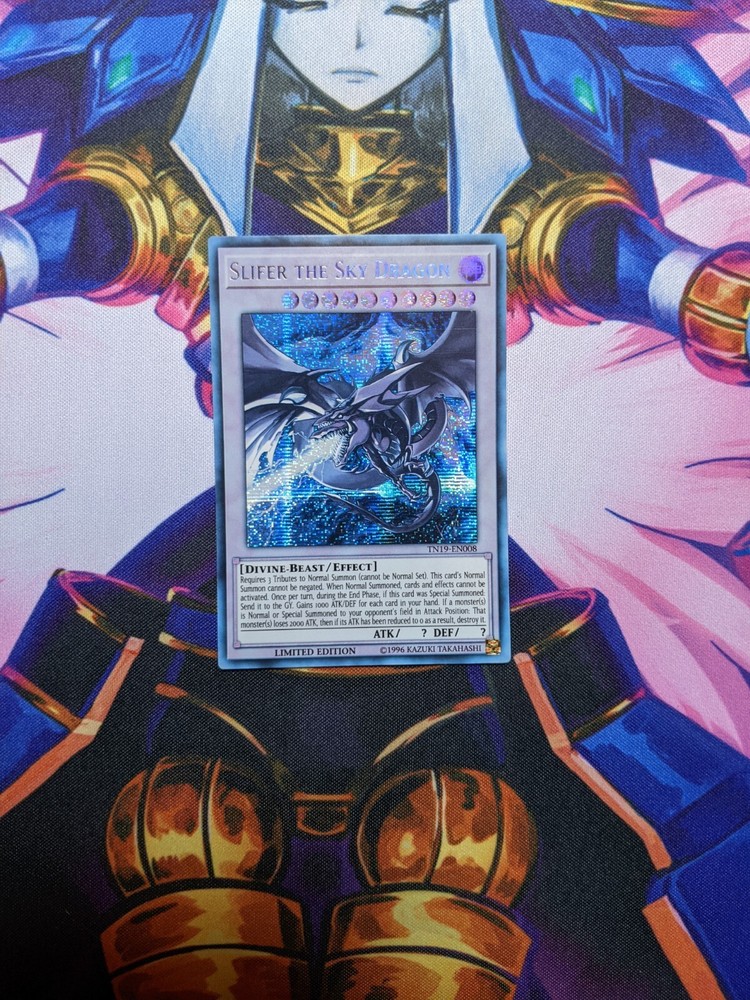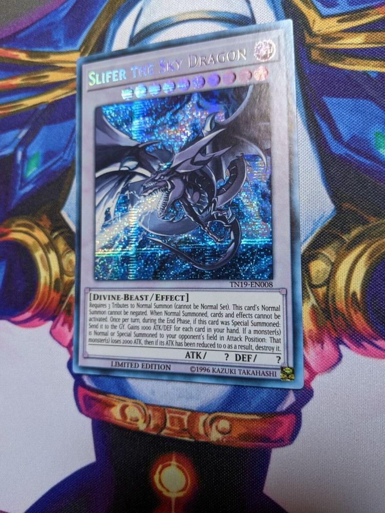 You are looking at an auction for a copy of Slifer the Sky Dragon from the 2019 megatin that has been altered with UV light to appear as a synchro monster