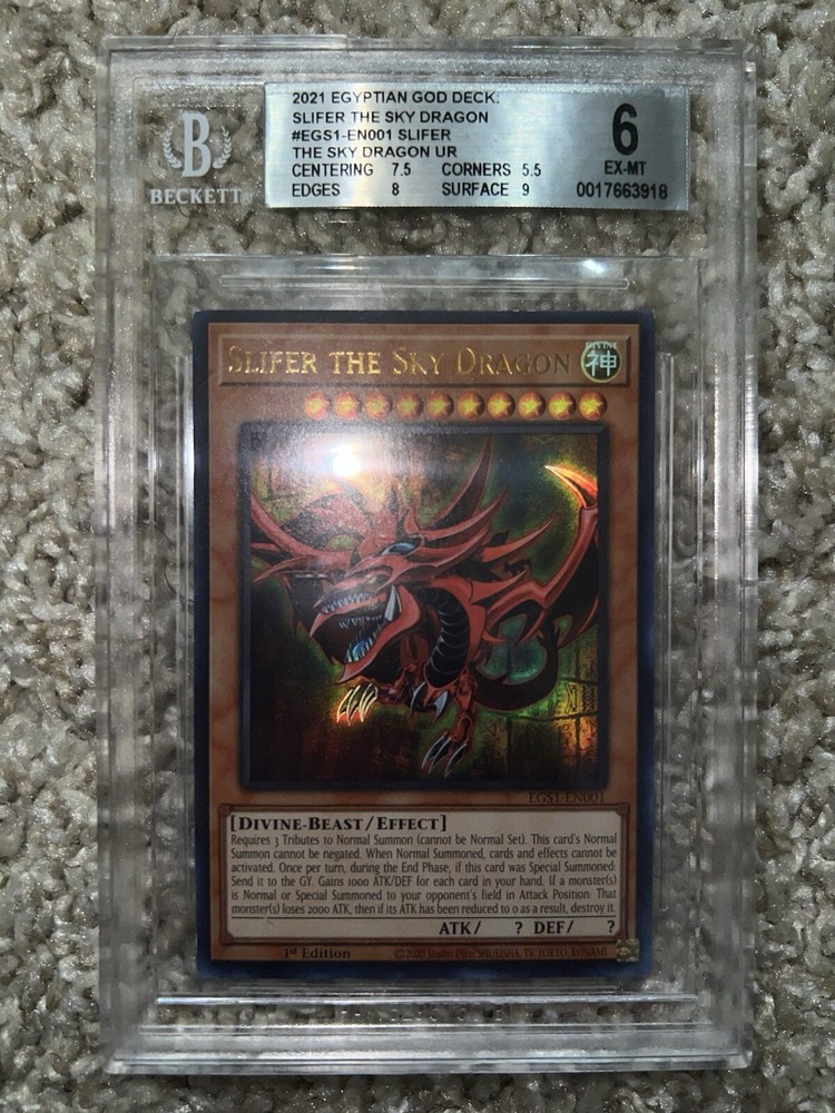 Slifer The Sky Dragon EGS1-EN001 is a 1st Edition Yu-Gi-Oh! TCG card from the Egyptian God Deck. This Secret Rare card is a Divine-Beast monster with a Holo finish. It has been professionally graded by Beckett Collectors Club Grading (BCCG) with a grade of 6. The card is not autographed and manufactured by Konami.