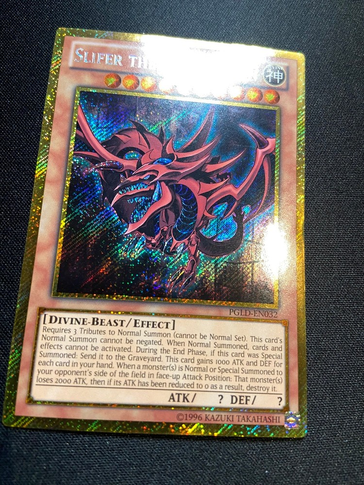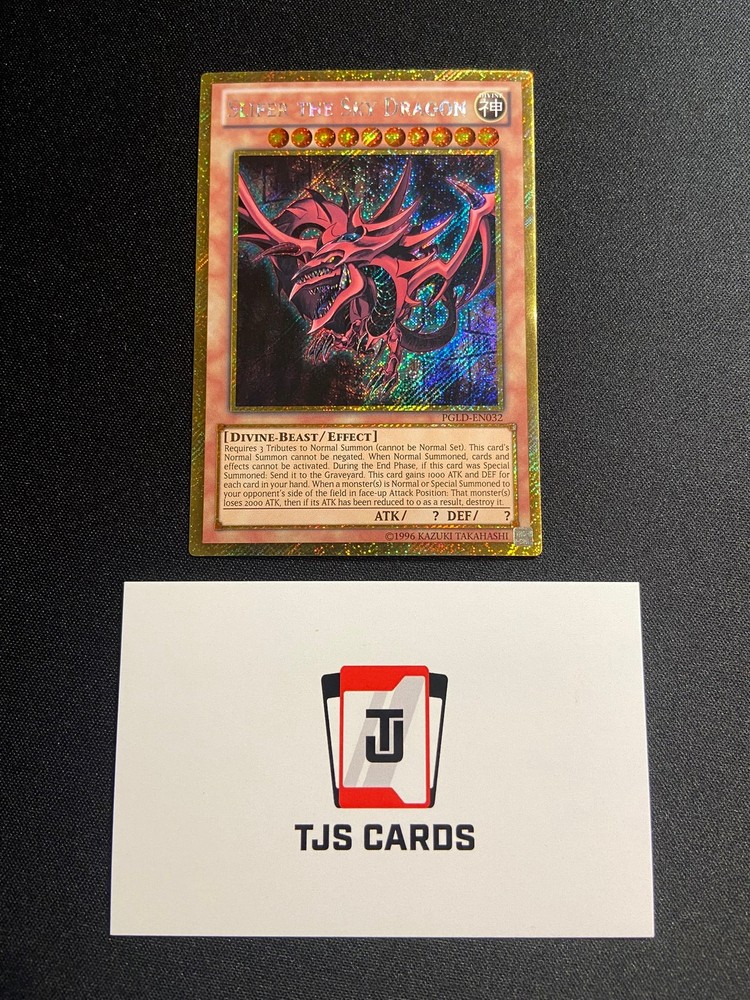 Slifer The Sky Dragon - Gold Secret Rare PGLD-EN032 - LP - YuGiOh Slifer The Sky Dragon - Gold Secret Rare PGLD-EN032 - LP - YuGiOh Light Play Card as seen in the images provided. If multiple quantities are available, you may not receive the exact card pictured, however, the card will be in the stated condition. If there are imperfections hard to see in the original images, I have provided more images to show these All cards are near mint, unless stated otherwise, other conditions are as follows: Near Mint (NM) Lightly Played (LP) Moderately Played (MP) Heavily Played (HP) Damaged (DMG) Listing and template services provided by inkFrog