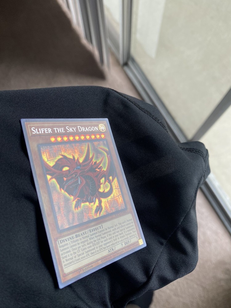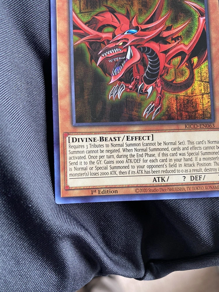 Slifer The Sky Dragon - KICO-EN063 - Secret Pharaoh’s Rare - 1st Edition - M/NM. Freshly pulled straight to sleeve and protective case DOES NOT COME WITH FIGURE, sorry but I just got it after months of wait lol you can buy it on the Crunchyroll store.