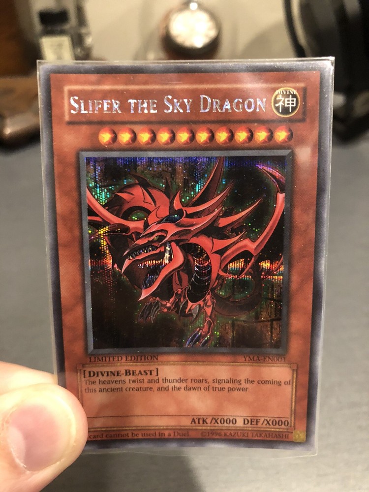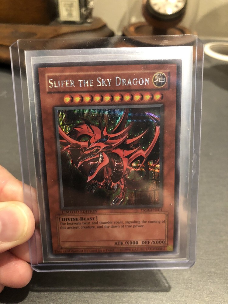Slifer The Sky Dragon YMA-EN001 Yu-Gi-Oh! TCG Card NM Secret Rare Promo. This is an incredibly rare and sought after Yu-Gi-Oh! Promotional card, the Ani-Manga release of the vaunted and iconic Slifer the Sky Dragon card, printed in glittering Prismatic Secret Rare. This card is ungraded but in terrific condition, with no visible flaws or scratches and in my opinion qualifies as near-mint. Card will be shipped with tracking and in multiple sleeves, including a hard-plastic top-loader to prevent damage.