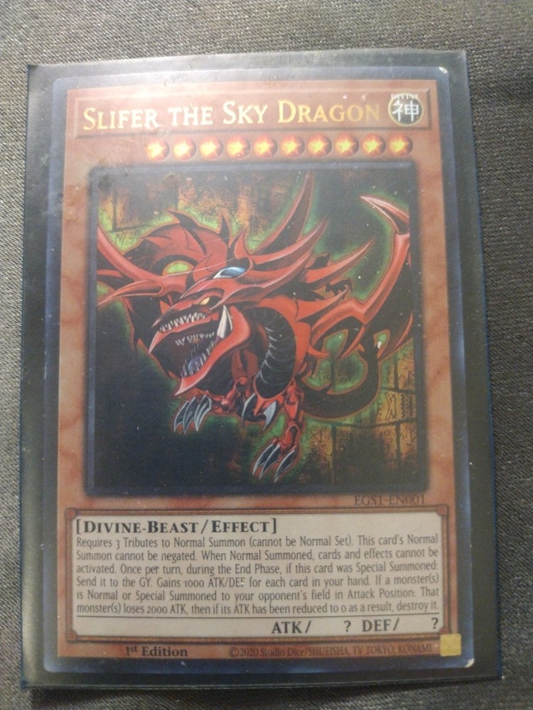 Slifer The Sky Dragon Yu-Gi-Oh is a premium gold secret rare card in the Yu-Gi-Oh! TCG. This divine-beast creature card requires 3 tributes to summon and gains 1000 ATK and DEF for each card in your hand. When a monster is summoned to the opponent's side in attack position, that monster loses 2000 ATK and is destroyed if it has been reduced to 0 ATK. This card is of 1st edition and in English language, manufactured by Konami and has a level of 10. It is a highly sought-after collectible for fans of the game.