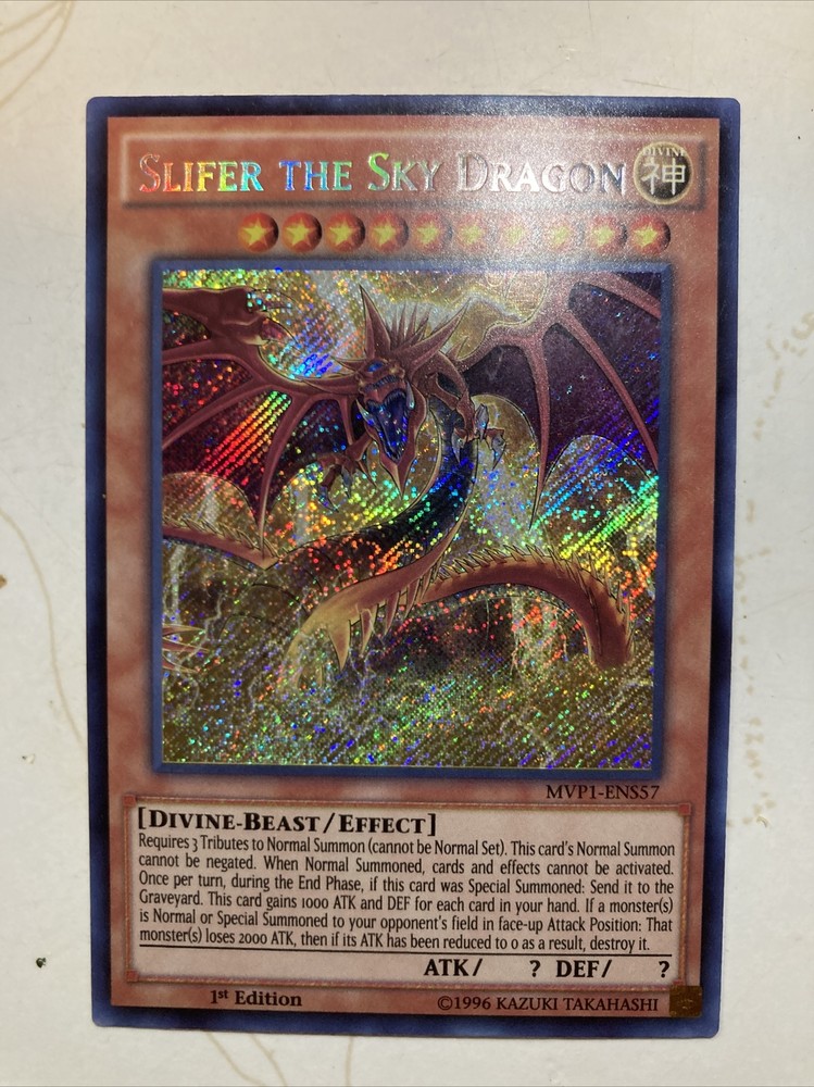 This listing is for one 1st edition prismatic secret rare Slifer the Sky Dragon, useable in a duel. Near mint condition. This is an uncommon alternate art of the card image....