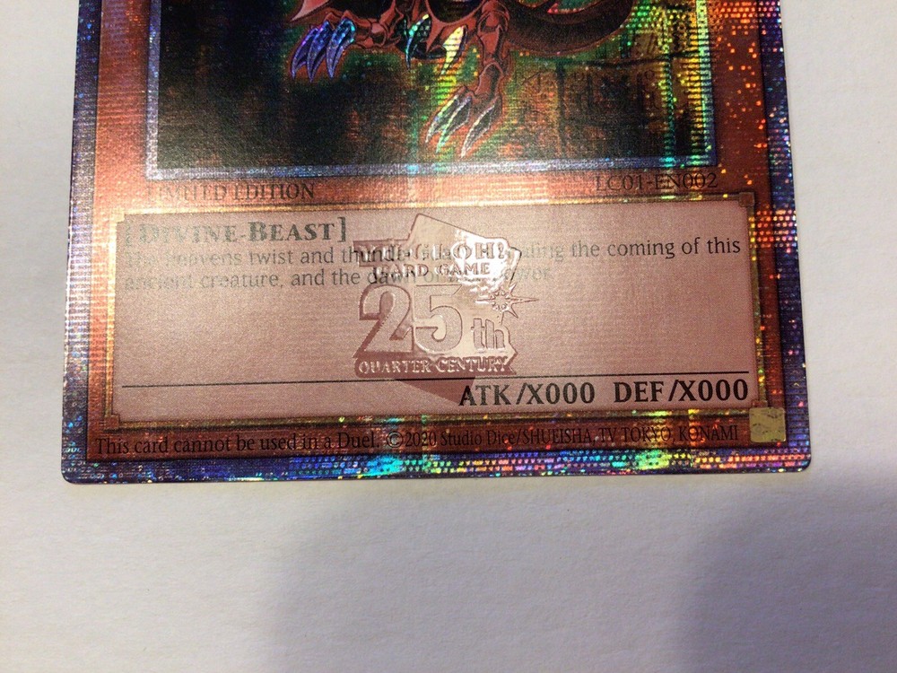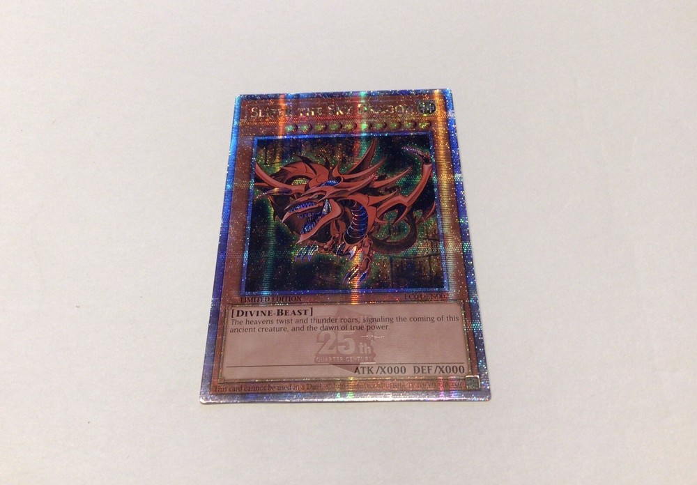 This is a rare opportunity to own a Secret Rare Slifer the Sky Dragon card from the Yu-Gi-Oh! Trading Card Game. This Quarter Century edition card is part of the Legendary Collection 1 and manufactured by Konami. Slifer the Sky Dragon is a powerful monster card with 1000 attack points and 1000 defense points, and its special ability allows it to gain 1000 attack points for each card in your opponent's hand. This card is in near-mint condition, making it a great addition to any Yu-Gi-Oh! card collection. Don't miss out on the chance to own this iconic card!