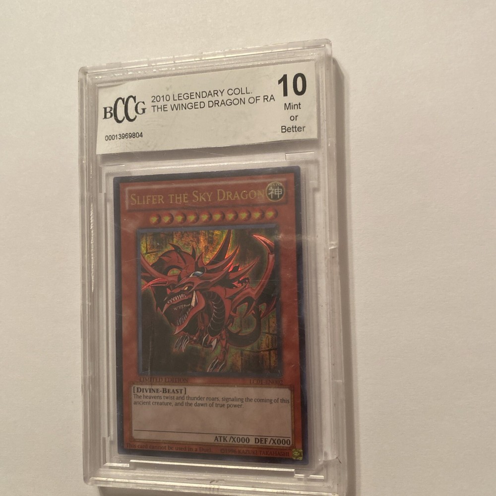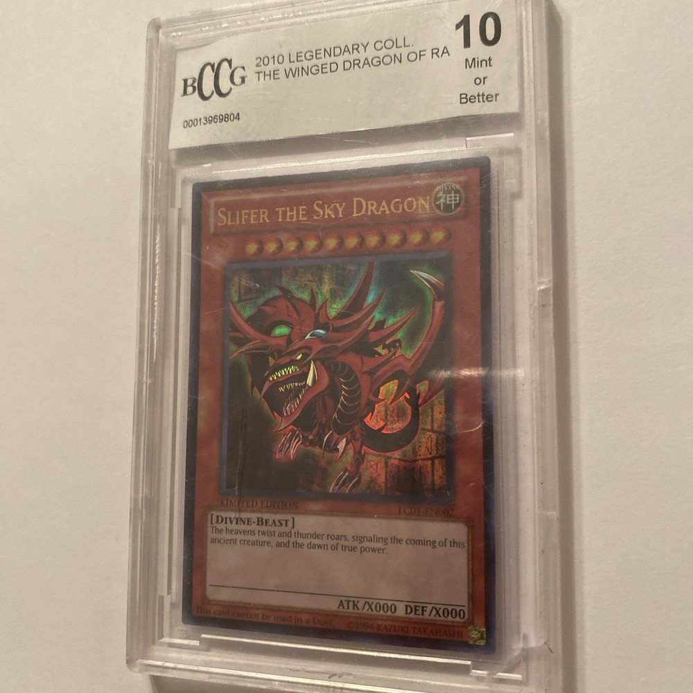 This is a limited edition card from the Yu-Gi-Oh Legendary Collection 1 set. The card features the Divine-Beast type creature, Slifer The Sky Dragon, with 0 defense and 0 attack power. It is an ultra rare card with an English language print. The card number is LC01-EN002 and it is an effect type card. The manufacturer is Konami and it is part of the Collectible Card Games category under Toys & Hobbies. This card is perfect for any Yu-Gi-Oh! TCG collector or player looking to add a unique and powerful card to their deck.