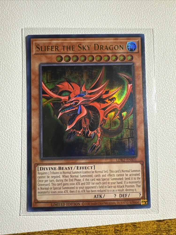 The product is a limited edition Yu-Gi-Oh! trading card called Slifer The Sky Dragon, from the Legendary Decks II set. It is a divine attribute card with a divine-beast creature type, and has a rarity level of ultra rare. Manufactured by Konami, this English language card features powerful attack and defense stats that are not specified, as well as unique gameplay mechanics specific to its effect card type. Perfect for collectors and players alike, this limited edition card offers a valuable addition to any Yu-Gi-Oh! TCG collection.