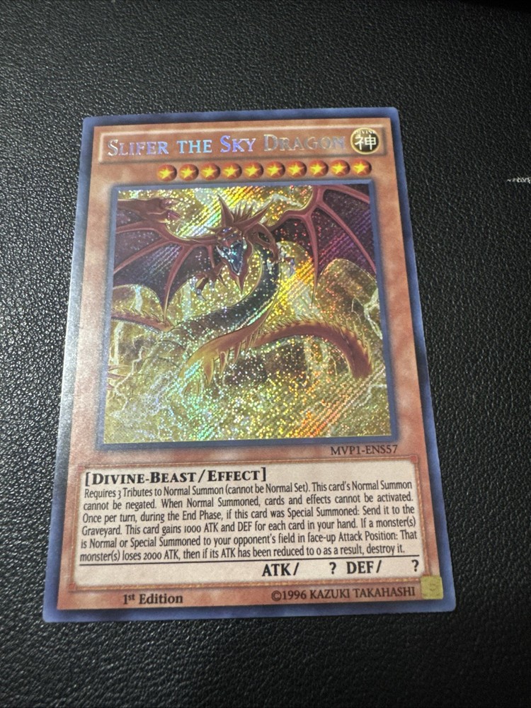 Slifer the Sky Dragon MVP1-ENS57 from The Dark Side of Dimensions Movie Pack Secret Edition is a powerful Effect-type card with a Divine attribute. This 1st Edition Secret Rare card is a must-have for collectors and players alike, manufactured by Konami and featuring the iconic Divine-Beast creature/monster type. The card is in English and has the card number MVP1-ENS57. LP