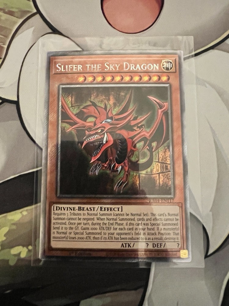 Slifer the Sky Dragon is a Platinum Secret Rare card from the Yu-Gi-Oh! TCG, featuring the character Seto Kaiba and the Divine-Beast creature type. This Japanese-sized card with a foil finish and 1st Edition feature is a sought-after collectible among fans of the game. Manufactured by Konami in Japan, this card is a valuable addition to any Yu-Gi-Oh! card collection, perfect for players aged 6 and up who appreciate the power and lore behind this iconic creature.