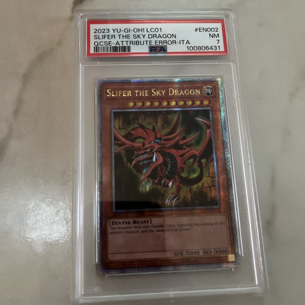 Slifer the Sky Dragon is a Quarter Century Secret Rare card from the Legendary Collection: 25th Anniversary Edition of the Yu-Gi-Oh! TCG. It is a Divine-Beast creature with 0 Defense and 0 Attack, featuring limited edition status and English language. Produced by Konami, this Effect card has the card number LC01-EN002.