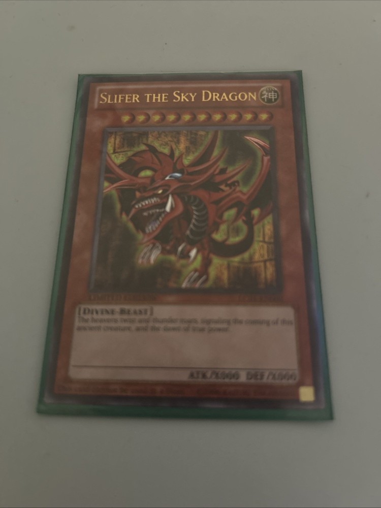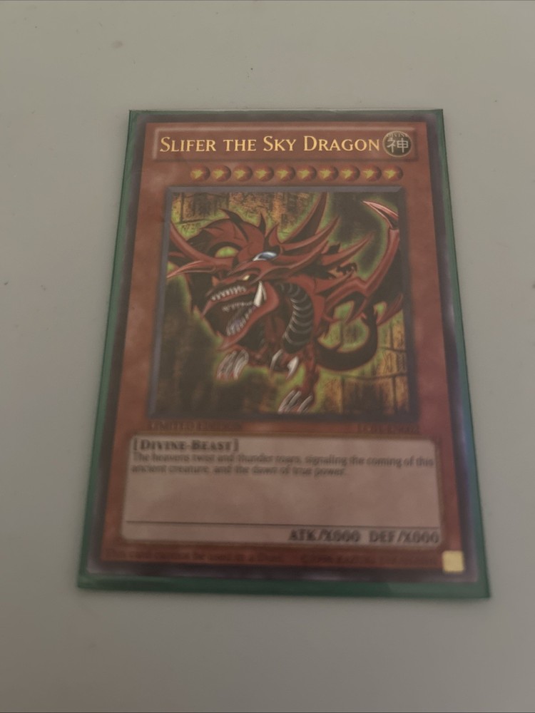 Slifer the Sky Dragon (Secret Rare) GBI-001 Yu-Gi-Oh! Duel Monsters International is a highly sought-after collectible card from the Yu-Gi-Oh! TCG. This card belongs to the Divine-Beast category, with an attribute of Light. It is a Secret Rare card from the Yu-Gi-Oh! Duel Monsters International: Worldwide Edition set, manufactured by Konami. This English-language card features Unlimited edition printing and is a Normal type card with a unique card name and number. With no Defense/Toughness or Attack/Power stats listed, this card appeals to collectors of rare Yu-Gi-Oh! cards.