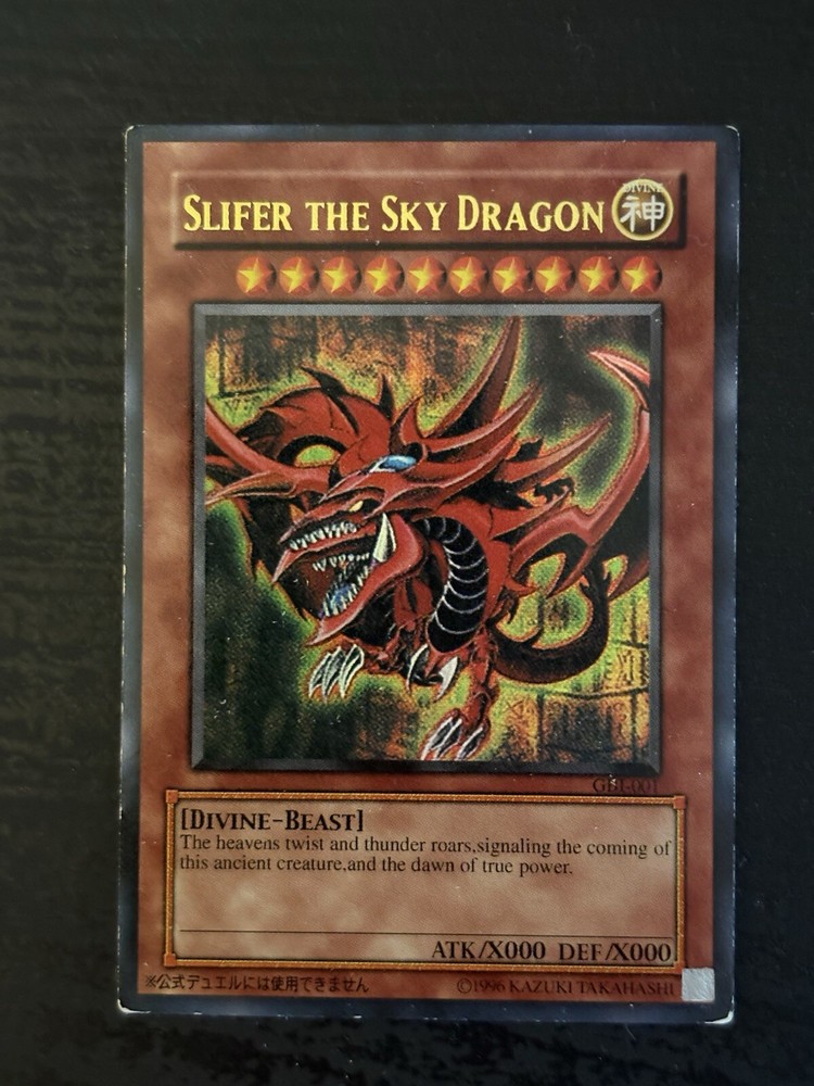 Slifer the Sky Dragon (Secret Rare) GBI-001 is a Divine-Beast creature card from the Yu-Gi-Oh! TCG. It is part of the Yu-Gi-Oh! Duel Monsters International: Worldwide Edition set and features unlimited playability. This English-language card by Konami has 0 Defense/Toughness and 0 Attack/Power, making it a powerful and rare addition to any collection.