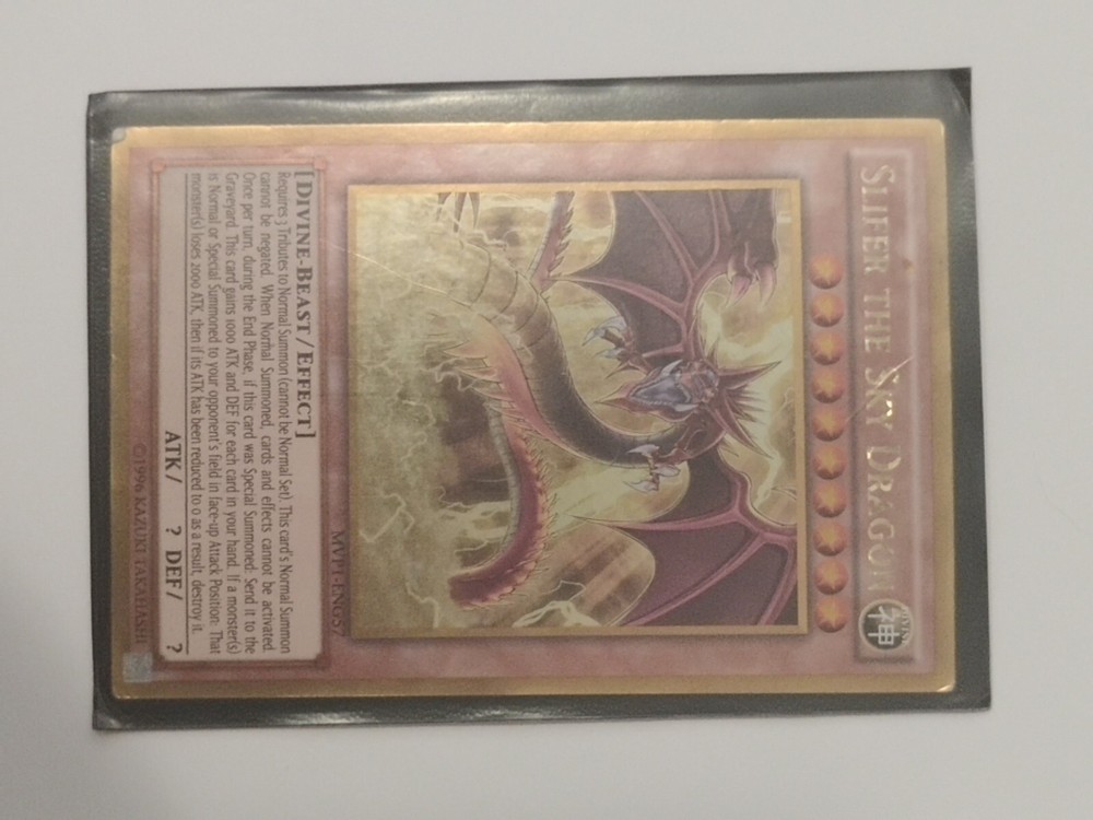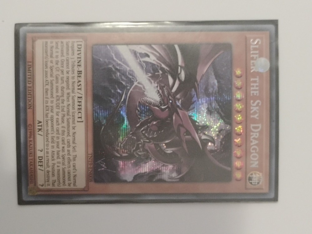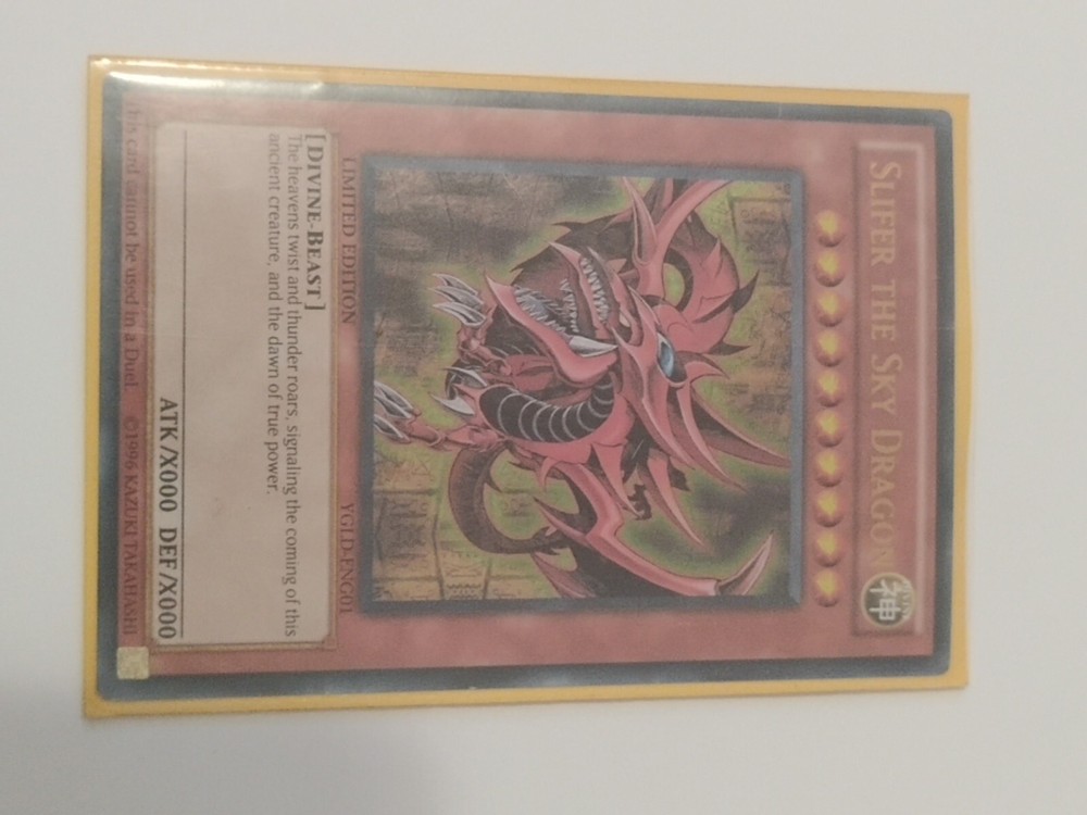 "Slifer the Sky Dragon" is a Legendary Yu-Gi-Oh! card featuring Seto Kaiba's Divine-Beast creature. Part of the "Slifer the Sky Dragon Trio," this Limited Edition holo card from the - Yugi - set is a rare find for collectors and fans of the Yu-Gi-Oh! TCG.
