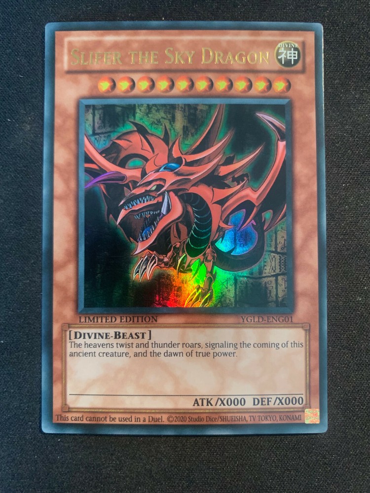 Slifer the Sky Dragon - Ultra Rare - YGLD-ENG01 N/M Card is Unlimited Card is in Near Mint Condition Combined Shipping is offered on all of my TCG Listings. When Checking out with multiple cards in your cart, click ‘Request total from seller’. This will allow me to combine the shipping for multiple cards if purchased together. If this does not show up for you, then please message me and I’ll create a listing for your order. Any Further Questions Please Message Me Thanks