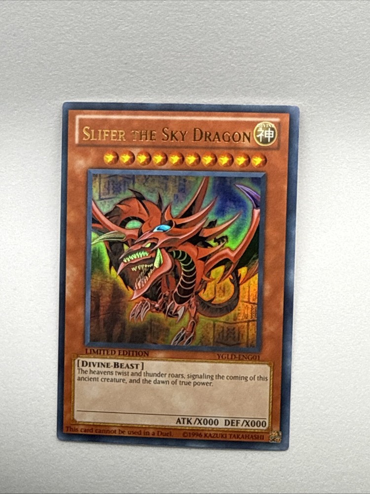 This is an ultra rare Slifer the Sky Dragon card from the King of Games: Yugi's Legendary Decks set. It features the Divine-Beast creature type and has 0 defense/toughness and 0 attack/power. The card is a normal type and has the limited edition feature. The card number is YGLD-ENG01 and it is in English language. The manufacturer is Konami.