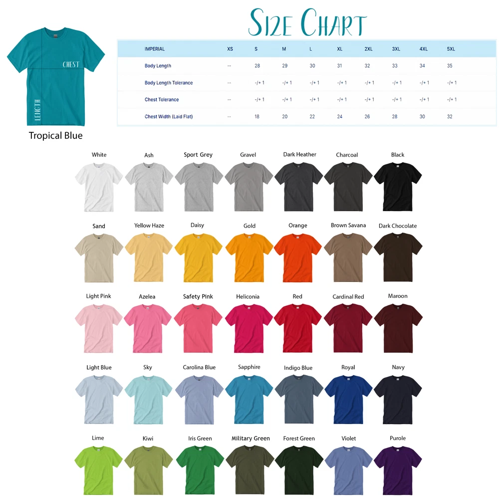 ITEM DESCRIPTION Made by Gildan 100% Cotton (fibre content may vary for different colors) Light fabric (5.3 oz/yd² (180 g/m²)) Tear away label Runs true to size ** PLEASE NOTE: Due to lighting effect and computer color, the actual color may be slightly different from the picture, please understand. Please allow 0.3-0.5" / 1-2 cm differs due to manual measurement. ** For any other COLORS, SIZES, DESIGNS, please message us. OUR PRODUCTS : are made in & shipped from UNITED STATES, shipping to US and CANADA area will be faster. If you want to buy shirts in 6XL or in bulk, pls contact us. SIZING The items are US size , so make sure you have checked the following size chart before buying. O ur t-shirts are print-on-demand products, please fix your t-shirt size before you make a payment. We can not accept a return because of incorrect t-shirt size. We just accept returns for defects or errors on our part (damage, bad printing result,...). For women, this shirt is a Men's size tee, you should buy one size smaller than your usual size. Pls refer to the size chart, look at row or column that best corresponds with your measurements and you'll be able to identify your accurate size. SHIPPING We will ship to the shown Address on your PAYPAL Payment, please confirm your shipping address in the PayPal Account before buying. This is a print on demand product, the standard shipping time is about 3 - 5 business day , however, it usually takes 1-3 business days for handling. It takes about 3 - 5 business days for delivery for USA order, 5 - 10 business days for delivery for Canada order, and 10 business days or more for worldwide shipment. We use a selection of shipping services such as UPS, FedEx, USPS, DHL etc. Local pickups options are not provided at this time. It may take longer for the package to be delivered in Holiday seasons. Deadline for Christmas and New Year Holiday orders is 15th of Dec. PAYMENT We accept payment by any of the following methods: Please pay as soon as possible after winning an auction, which allows us to post your item to you sooner! RETURN POLICY If you are not satisfied with our products and services, please do not leave negative or neutral feedbacks before giving us an opportunity to resolve the problem first. If the products are damaged or defective, please feel free to contact us with some pictures of the defective items, we will proceed to send you a replacement asap. For any reason you are unsatisfied with our products, please contact us so we can talk about the options, simply return your order to us and we will either send a replacement or refund your money ( excluding shipping fee ). Shipping is the responsibility of the buyer and is " NON REFUNDABLE ". FEEDBACK *THANK YOU FOR SHOPPING WITH US*
