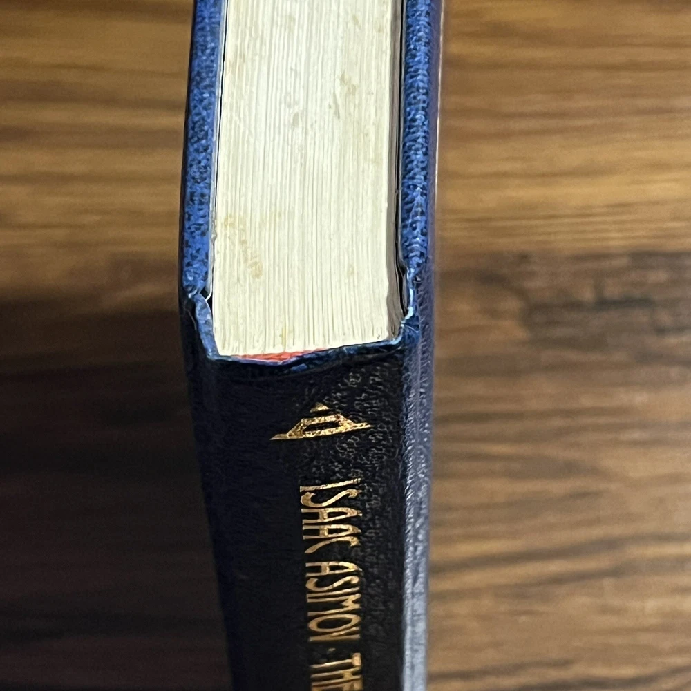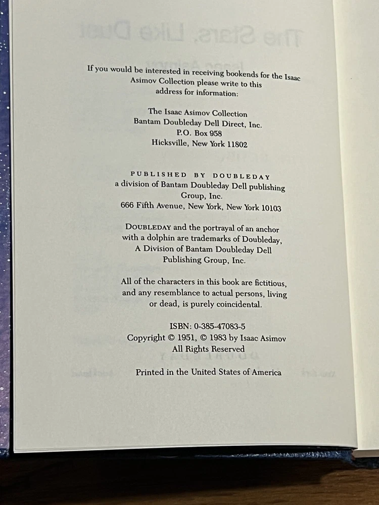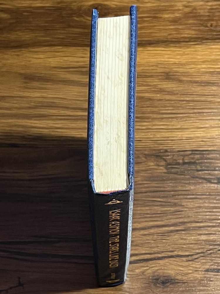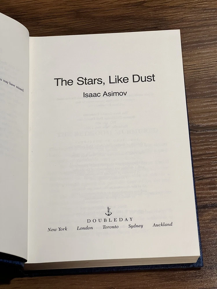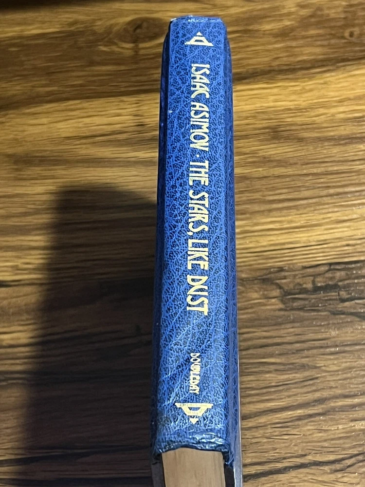 This is a used faux leather Doubleday edition of “stars, like dust” the leather is slightly wrinkled on the lower past of the spine. Please review all pictures carefully before purchasing, as they depict the exact item for sale.