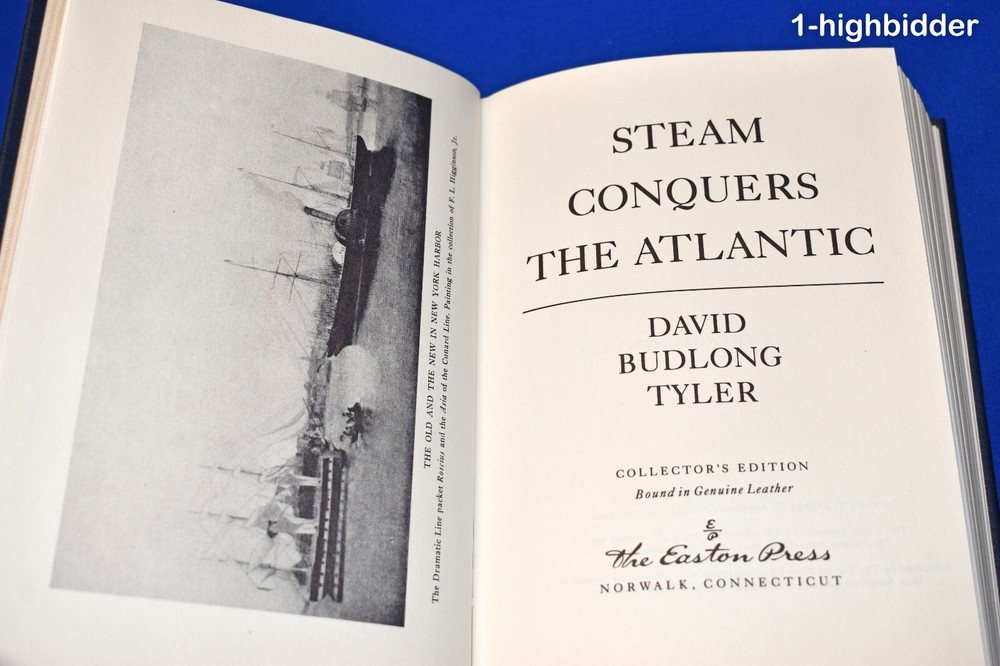 Steam Conquers the Atlantic Migration Taylor Leather Easton Press Collector's Edition _________________________________________ Steam Conquers The Atlantic by David Budlong Tyler Published by Easton Press, Norwalk CT (1991) The 1818 steamboat Savannah was the first steamship to cross the Atlantic Ocean. It was built as a sailing vessel in New York, measuring 98 feet in length and 320 tons. …the transition from sail to steam in the transatlantic immigrant trade was an event of enormous significance for the history of immigration. --Maldwyn Allen Jones, American Immigration, p. 157. Condition: BRAND NEW 1st Thus Collectors Edition Easton Press Leather Bound Book! The binding is tight and all 425 pages within are bright white with NO writing, underlining, high-lighting, rips, tears, bends, or folds. The covers look perfect! The gold gilt page edges are without flaw, and the inner book appears unread and perfect. Also included with this book is a brand new Easton bookplate and the collectors notes that were issued with the book. You will be happy with this one! Always handled carefully and packaged securely! Buy with confidence from a seller who takes the time to show you the details and not use just stock photos. Please check out all my pictures and email with any questions! Thanks for looking! About the Book: This book includes the classic Easton Press signature features: Premium Leather Silk Moire Endleaves Distinctive Cover Design Hubbed Spine, Accented in Real 22KT Gold Satin Ribbon Page Marker Gilded Page Edges Long-lasting, High Quality Acid-neutral Paper Smyth-sewn Pages for Strength and Durability Beautiful Illustrations About Easton Press Books (from their website): Easton Press is a world-leader in the design and development of fine leather-bound books, stamped on the spine with 22kt gold. For over three decades, we have been serving the needs of collectors to acquire luxurious volumes of lasting meaning, beauty and importance. We take great pride and pleasure in presenting collectors and enthusiasts with a wide variety of heirloom editions, made to exacting standards and meant to be cherished for generations of readers. You will savor the classic editions of Moby Dick, Jane Eyre, and The Odyssey with our landmark series, The Greatest Books Ever Written. We continue to offer exquisite signed editions by distinguished authors such as Diana Gabaldon, Anne Rice, Neil Gaiman, Madeleine Albright and Condoleezza Rice. Our Deluxe Limited Editions, hand-numbered and beautifully re-created from important historical volumes, will delight even the most discerning book collectors. And our superb selection of leather-bound coffee-table books make the perfect gift for any sports, history, or children's book collector. These are just a few of our many selections. Easton Press editions are bound in the U.S.A. with imported materials and have been shipped to collectors in 130 countries around the world. Copyright © 2018-2022 TDM Inc. The photos and text in this listing are copyrighted. I spend lots of time writing up my descriptions and despise it when un-original losers cut and paste my descriptions in as their own. It is against ebay policy and if you are caught, you will be reported to ebay and could be sued for copyright infringement and damages.