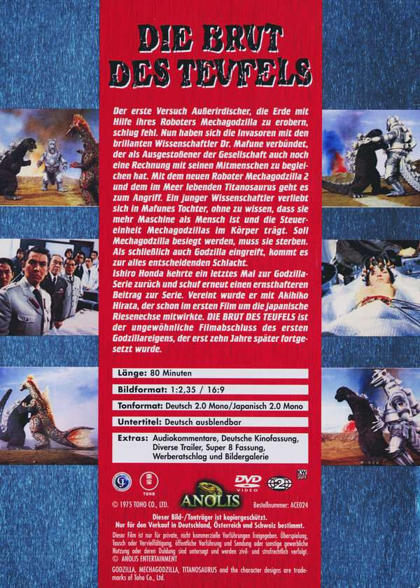 Hello! Please note the following: If this is a DVD or Blu-Ray offer: These are European discs from a German dealer. You may need a player with Regional Code 2, Regional Code Free (DVD) or Regional Code B (Blu-Ray) !!! If the discs are not playing, it is up to your player. A return of already open boxes is not possible !!! Thank you Steelbook Godzilla - the Breeding of Devil Ishiro Honda - Metalpack 2 DVD Box The description of this item has been automatically translated. If you have any questions, please feel free to contact us. HONDA Katsuhiko Sasaki Tomoko Ai Akihiko Hirata Katsumasa Uchida Goro Mutsumi Tadao Nakamaru Shin Roppongi Tomoe Mari Toru Ibuki THE BREED OF THE DEVIL Mekagojira no gyakushû Alternative title: The Escape of Mechagodzilla The Escape of Megagodzilla Godzilla - The Devil's Spawn Godzilla and the Clash of the Titans King Kong-Godzilla Mechagodzilla - The Spawn of the Devil Mechagodzilla vs. Godzilla Mechagodzilla's Terror Monsters from an Unknown Planet Monsters from the Unknown Planet Monsters of the lost continent Revenge of Mechagodzilla Terror of Mechagodzilla 2 DVD IN METAL PACK 1975 80 mins Language: German / Japanese Subtitle / subtitle: German FSK 12 The first attempt by aliens to conquer Earth with the help of their robot Mechagodzilla failed. Now the invaders have teamed up with the brilliant scientist Dr. Mafune, who, as an outcast from society, also has a score to settle with his fellow human beings. The new robot Mechagodzilla 2 and the sea-dwelling Titanosaurus go on the attack. A young scientist falls in love with Mafune's daughter, not knowing that she is more machine than human and carries Mechagodzilla's control unit in her body. If Mechagodzilla is to be defeated, she must die. When Godzilla finally intervenes, the all-decisive battle ensues. Bonus: Japanese version; audio commentary; German Super-8 version; 20-page booklet BRAND NEW Godzilla and the Clash of the Titans Mechagodzilla - The Spawn of the Devil Monsters from an Unknown Planet Monsters from the Unknown Planet The first attempt by aliens to conquer Earth with the help of their robot Mechagodzilla failed. Now the invaders have teamed up with the brilliant scientist Dr. Mafune, who, as an outcast from society, also has a score to settle with his fellow human beings. The new robot Mechagodzilla 2 and the sea-dwelling Titanosaurus go on the attack. A young scientist falls in love with Mafune's daughter, not knowing that she is more machine than human and carries Mechagodzilla's control unit in her body. If Mechagodzilla is to be defeated, she must die. When Godzilla finally intervenes, the all-decisive battle ensues. Japanese version; audio commentary; German S FSK-Einstufung 12 Format DVD Film-/Fernseh-Titel Steelbook GODZILLA - DIE BRUT DES TEUFELS Ishiro Honda - Metalpac Regionalcode DVD: 2 (Europa, Japan, Naher Osten…) Sprache Deutsch Sprache Japanisch Untertitel Sprache Deutsch Edition Box Set EAN 4041036310820 Genre Horror Genre Sci-Fi & Fantasy Herstellungsland und -region Deutschland