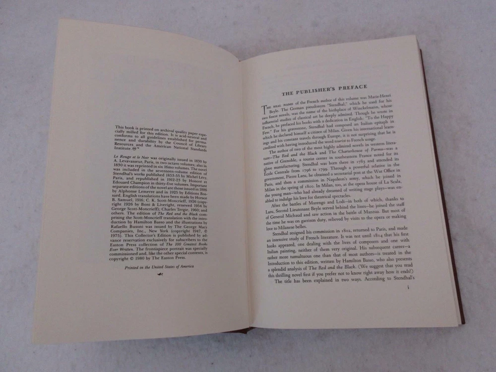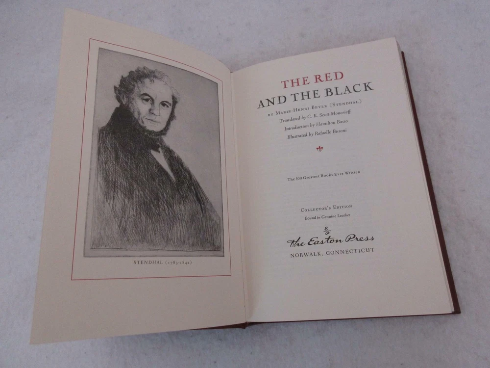 Stendhal (Marie-Henri Beyle) THE RED AND THE BLACK Translated by C. K. Scott-Moncrieff Introduction by Hamilton Basso Illustrated by Rafaello Busoni The Easton Press, Norwalk, Connecticut, 1980 100 Greatest Books Ever Written Condition: A Very Good Leatherbound Hardcover. Gilt has light shelfwear. Includes unused, unattached bookplate. Please examine photos for details. Condition: We strive to describe and photograph the condition of every item as accurately as possible. Photos are of the actual item that is being sold. Please examine the photos carefully for any condition details and possible flaws. Best Offers: Items are available for offers only after being listed for 30 days. We consider all offers in relation to current market values. We try to respond almost immediately to most offers. Most of our counteroffers are firm but we are open to bargaining. Shipping: We combine shipping. When ordering multiple items from us please request a total before paying. We charge postage based on weight plus $1 for each eBay listing. All of our orders are packed carefully to prevent damage during shipment. We ship most of our items within 24 hours. Contact Us: We are available 7 days a week and are happy to answer any questions you may have. Showcase your items with Auctiva's Listing Templates! THE simple solution for eBay sellers.