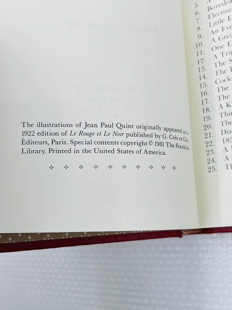 EXCELLENT NEAR MINT CONDITION This luxury edition collector's item, The Red and the Black by Stendhal, is a beautifully illustrated hardcover novel published in 1981 by G. Cres Et Cie. It is a historical book that belongs to the world literature and classics genre, perfect for young adults, ages 9-12, and adults alike. The book features a leather-bound cover, making it a vintage addition to your collection. It is in excellent condition, with no signs of wear and tear. Its personalized ex libris makes it a unique piece that any book lover would cherish. Don't miss this opportunity to own this timeless classic.