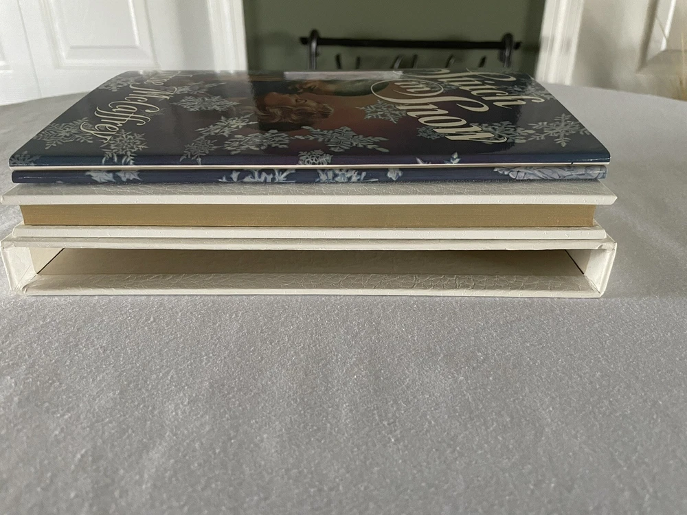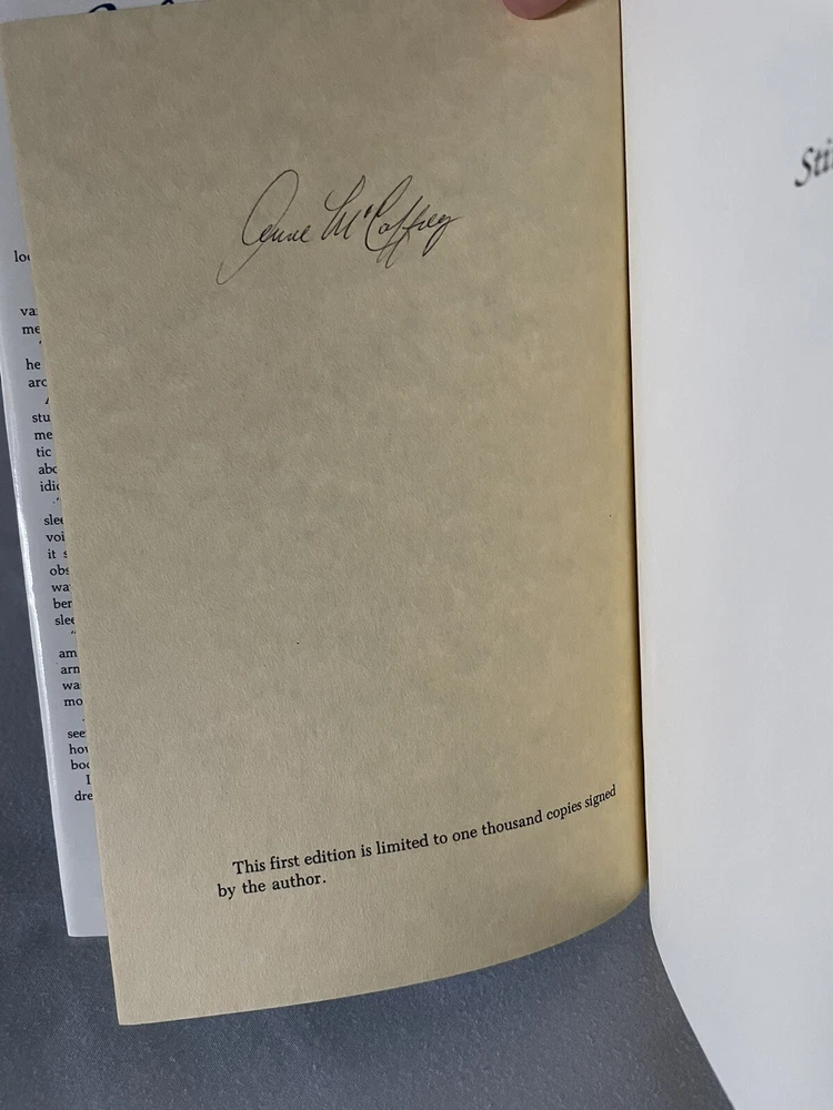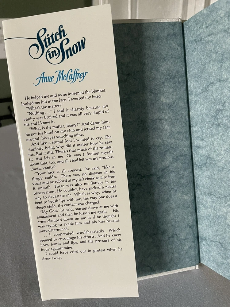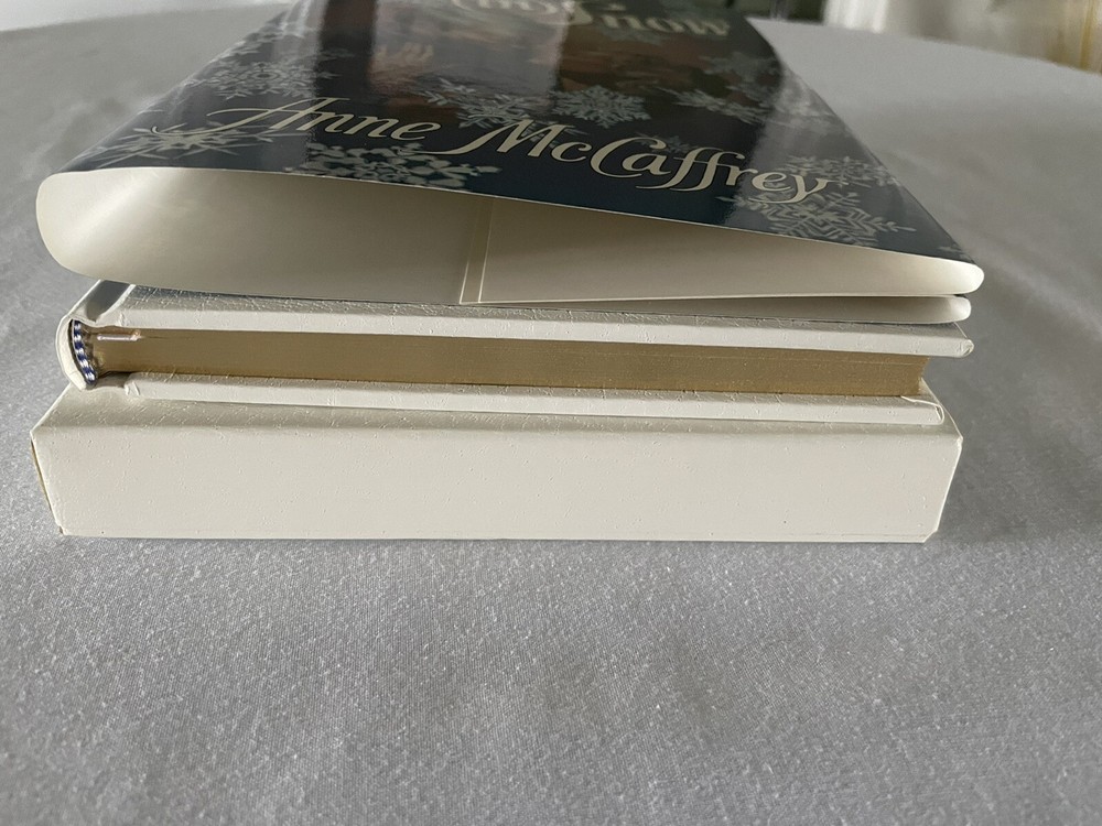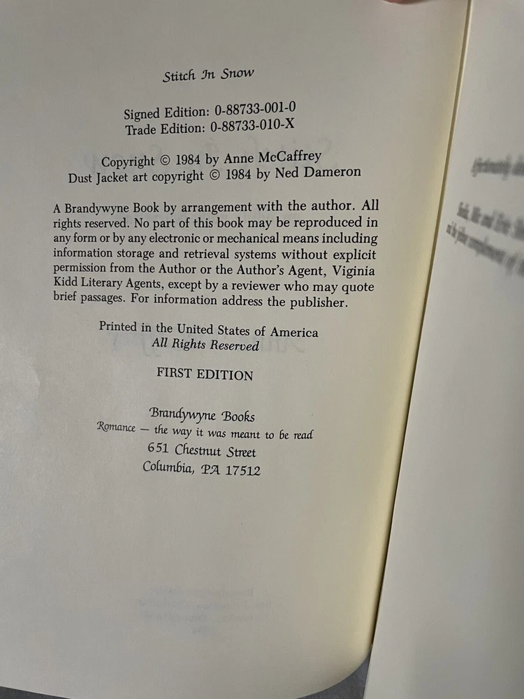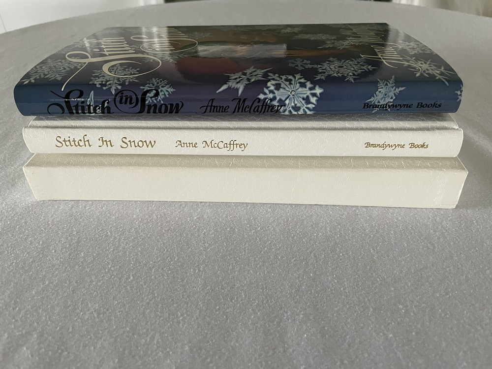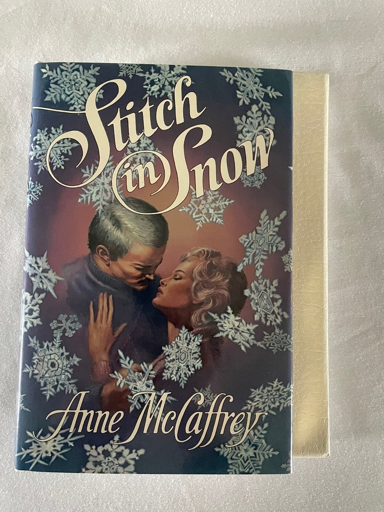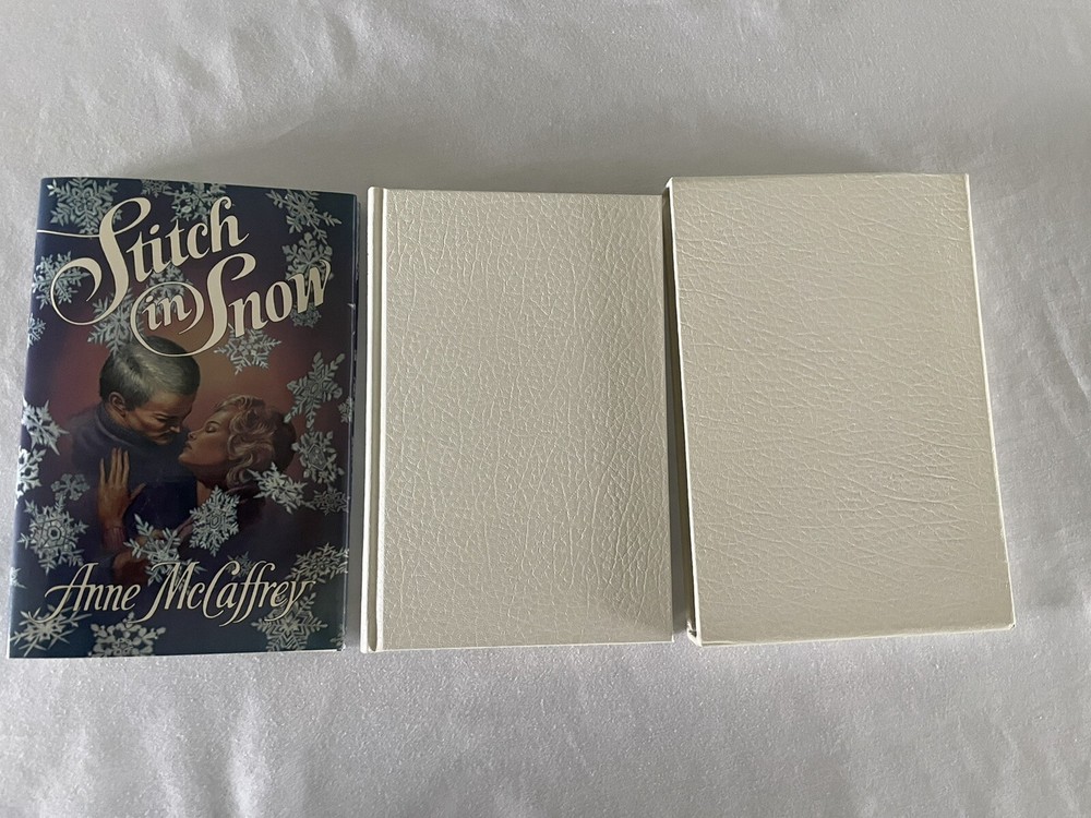 Stitch in Snow by Anne McCaffrey, dustjacket artwork by Ned Dameron ISBN: 0-88733-001-0 Published in 1984 by Brandywyne Books, San Francisco, CA and Columbia, PA First and limited edition, 1/1000 copies signed by Anne McCaffrey on the limitation page . Bound in white faux leather with gold foil stamp on the spine, blue marbled endpapers, gilt in gold along the edges of the text block, sewn in silk ribbon place marker, 176pp with dustjacket as issued and matching faux leather slipcase. Condition is as new, flawless unread copy. About the book from Goodreads: Dana Jane Lovell wrote books, knitted Arran sweaters, and tried not to worry about her grown-up son.She'd been widowed young and was lonely - though she usually didn't admit it. The man at Denver airport was large, distinguished, mysterious about his private life, and said his name was Dan.She thought he'd be a witty and amusing travelling companion. But they'd both reckoned without the storm - the deluge of snow that cut them off from the world they both knew and hurled them into a breathtaking relationship. Anne McCaffrey, creator of the Dragons of Pern, breaks into the world of adult romantic fiction with her spellbinding Stitch in Snow. Ships via USPS Media Mail bubble wrapped in a box.