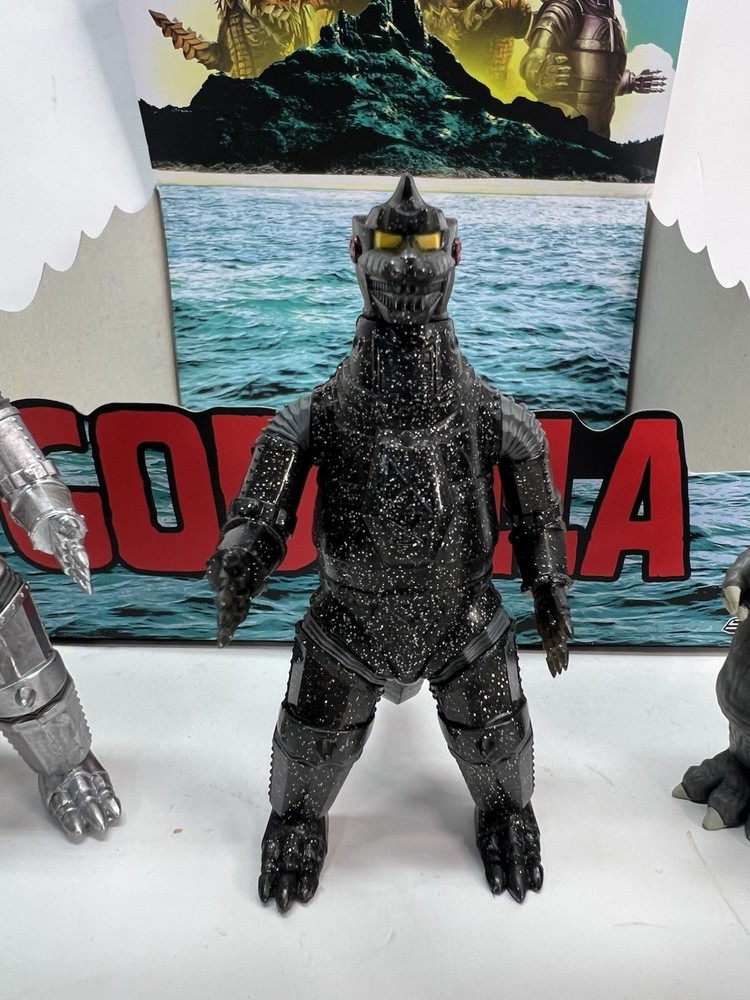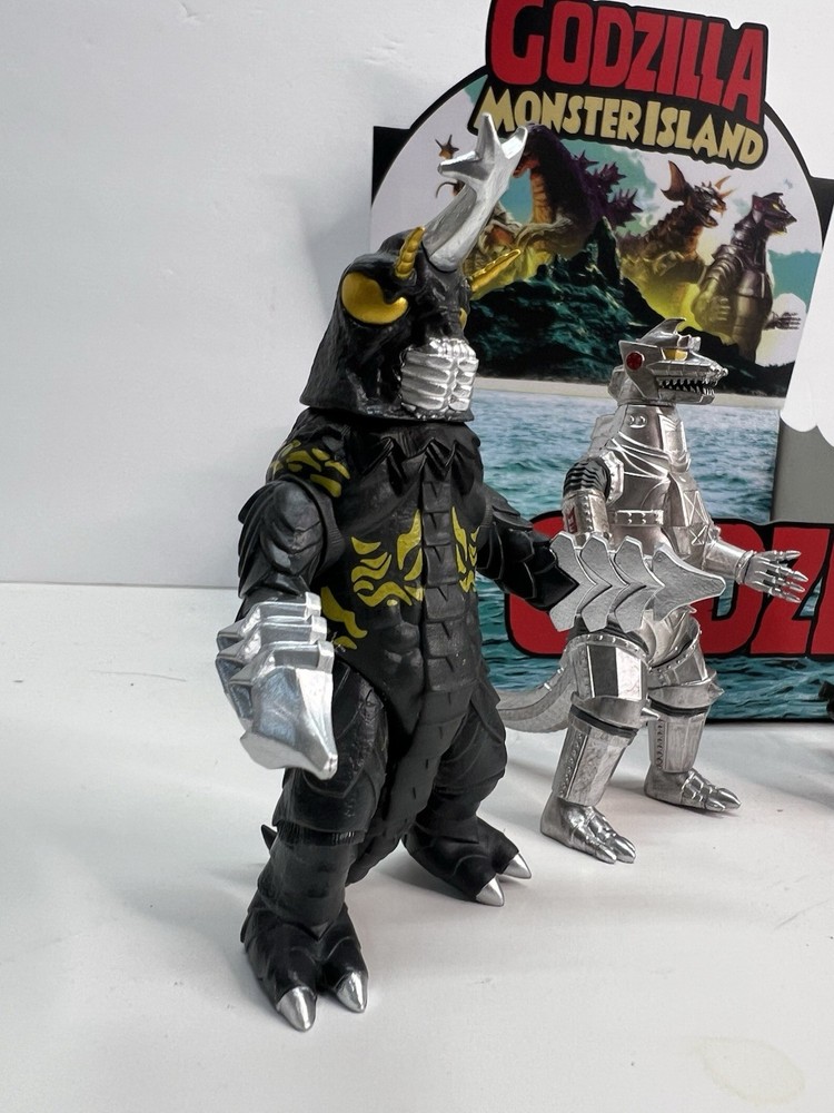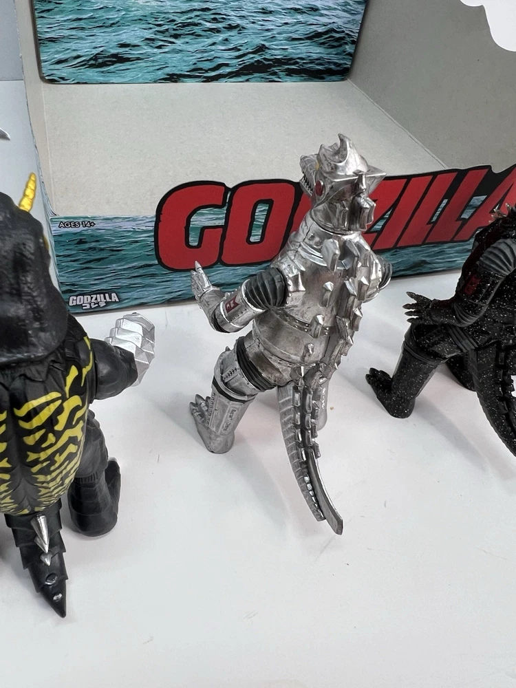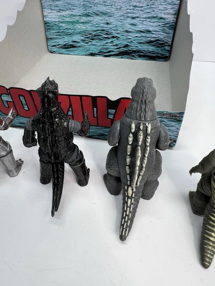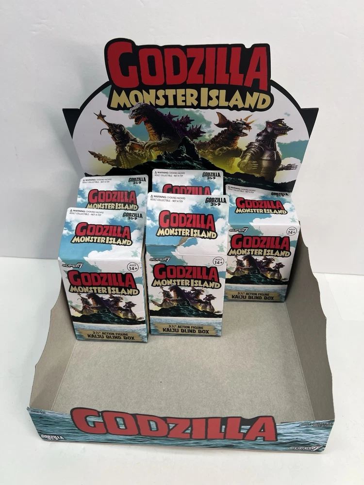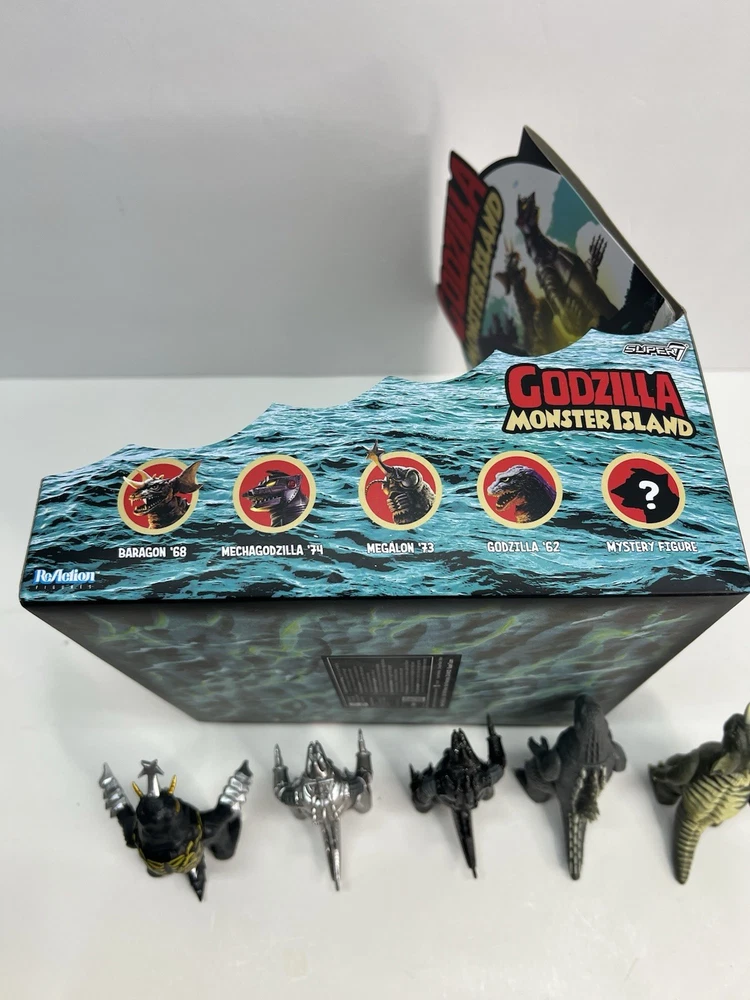 Complete set of 5 figures including the rare Chase Comes with display case box and individual blind boxes that are NOT sealed and have been opened to confirm figures. Figures are all brand new and never displayed, only removed for pictures. all-new 3.75” scale Toho Godzilla Monster Island Blind Box ReAction Figures! Inspired by the remote island sanctuary from the Godzilla film series, this Blind Box release features five unique kaiju designs—Megalon, Godzilla ’62, Baragon, Mechagodzilla ’74 (standard), and a mystery colorway of Mechagodzilla Godzilla Monster Island Blind Box ReAction Figures!