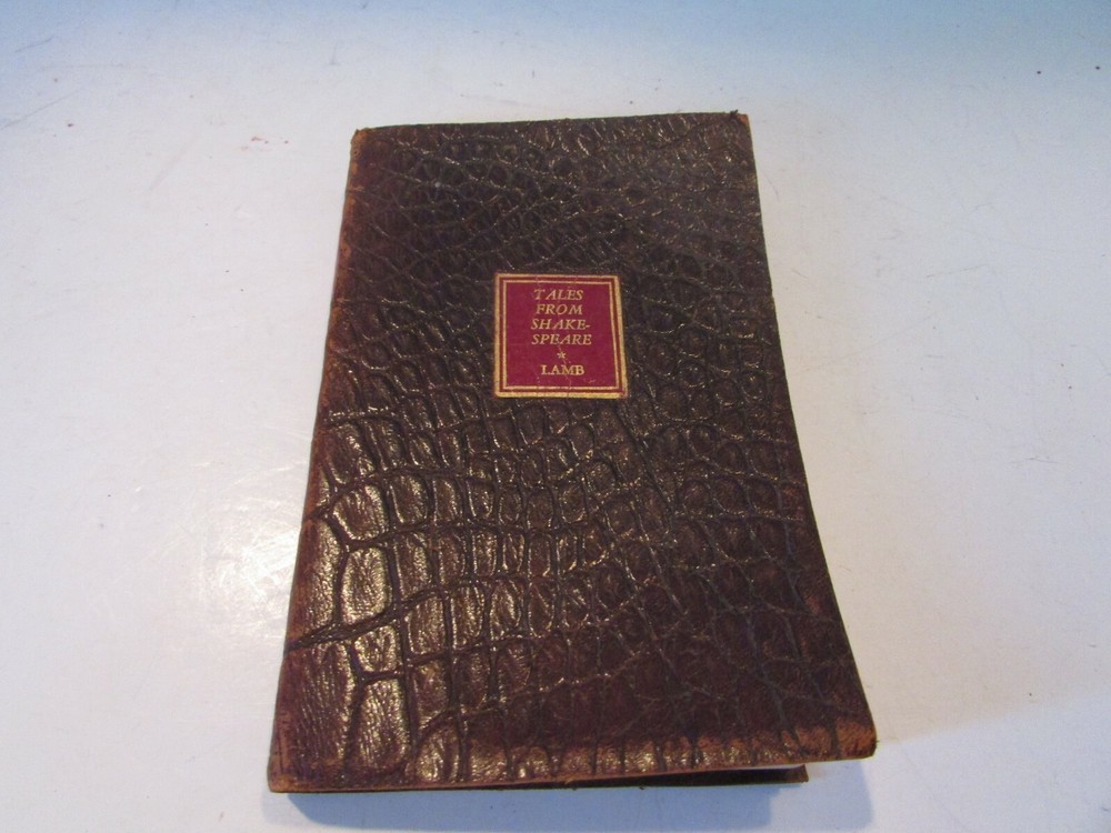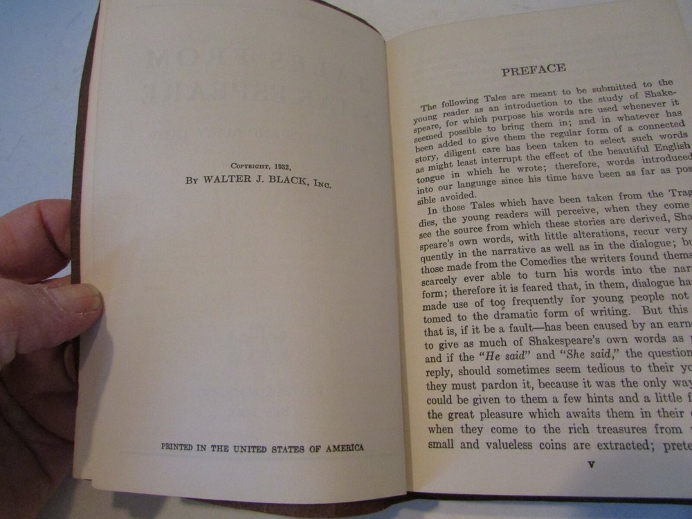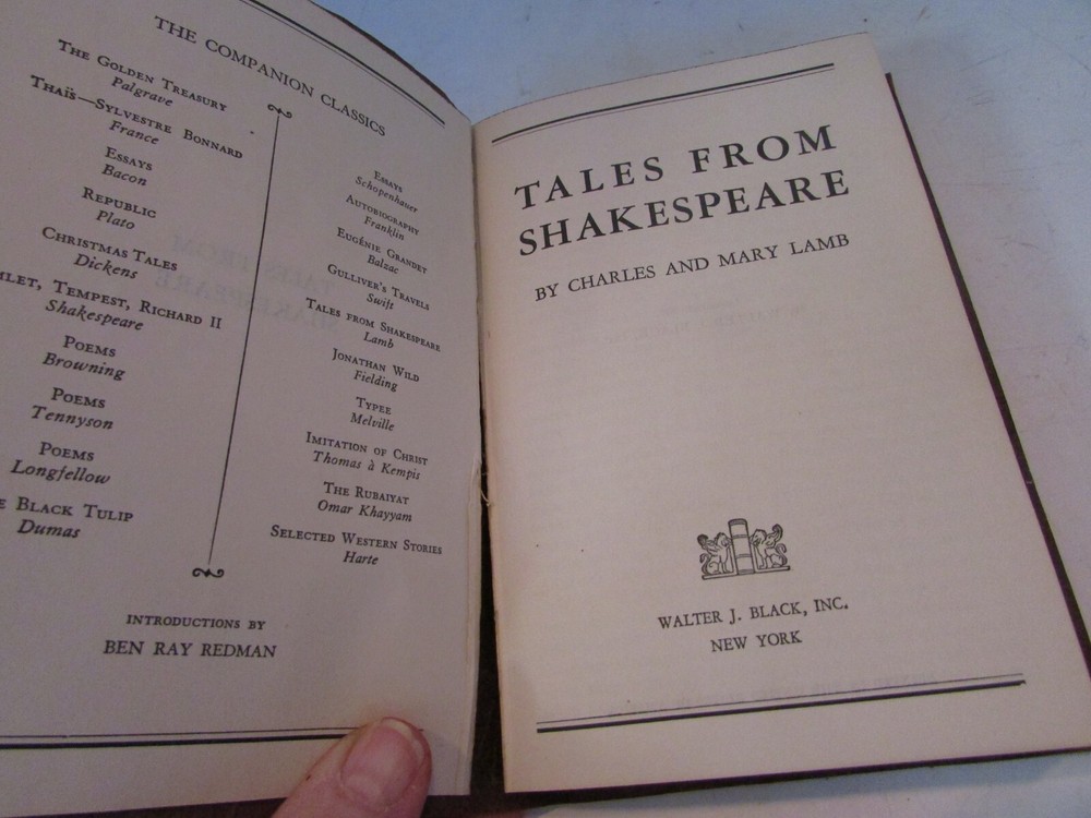 TALES FROM SHAKESPEARE BY CHARLES AND MARY LAMB 1932 WALTER J. BLACK INC. NY FIRST EDITION GENUINE LEATHER COVERED- SOFT COVER BOOK GOOD CONDITION PAGES INTACT PAGE OPPOSITE THE TITLE PAGE LOOSENING A BIT FROM SPINE OUTSIDE COVER IN GOOD CONDITION, SHOWING WEAR AROUND THE EDGES, NEEDS SOME FLATTENING OUT,(NOT A HARDCOVER BOOK, A LEATHER WRAPPED SOFTCOVER) SEE PICTURES FOR DETAILS OF CONDITION BUY SEVERAL ITEMS AND SAVE BIG ON SHIPPING. PLEASE WAIT FOR ME TO COMBINE YOUR INVOICE FOR THE BEST PRICE. THANK YOU FOR SHOPPING WITH ME. TAKE YOUR TIME, BROWSE MY STORE, LOTS OF MERCHANDISE, NEW LISTINGS DAILY. I DO MY BEST TO SHIP ASAP, CHECK MY FEEDBACK. RETURNS: UPON RECEIVING YOUR ORDER, IF THERE IS AN ISSUE WITH THE ITEM/S PLEASE CONTACT ME SO WE CAN WORK OUT A SOLUTION. THANK YOU AGAIN & FEEL FREE TO ASK ME QUESTIONS. THANKS