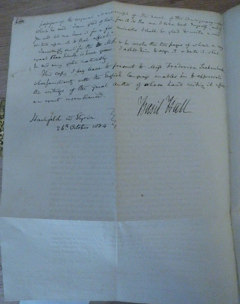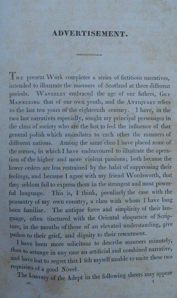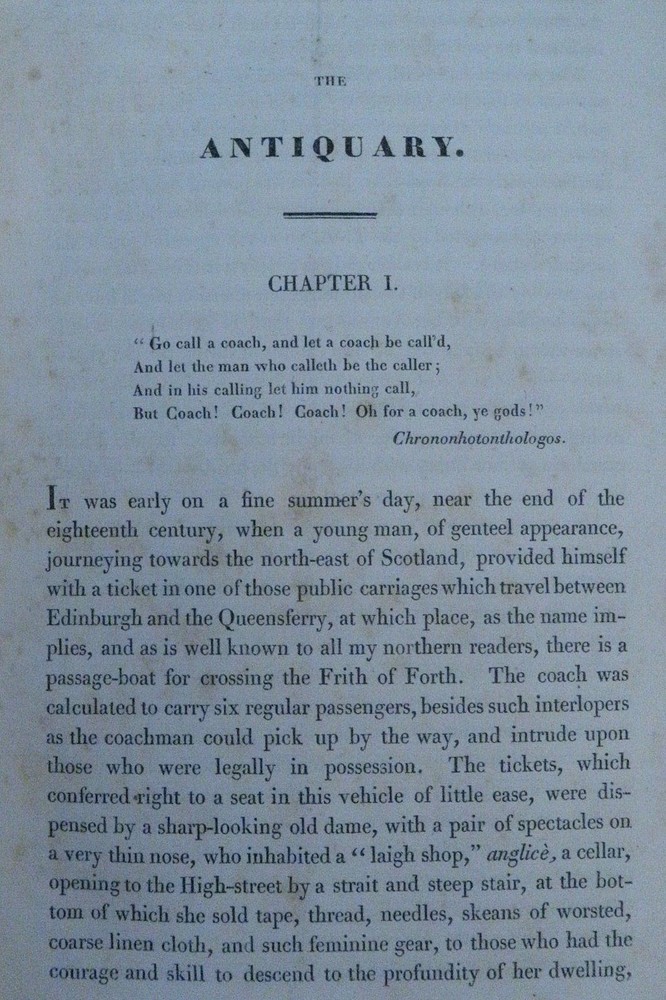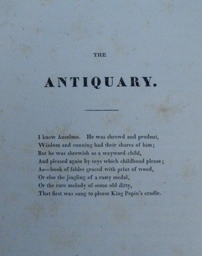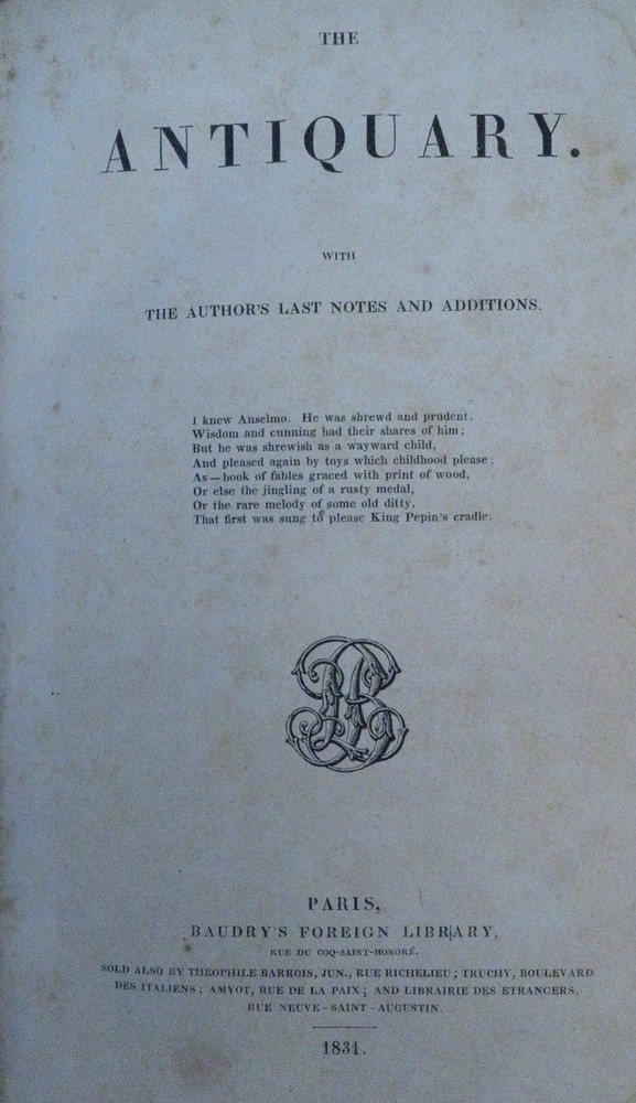THE ANTIQUARY Walter Scott 1831 - 1st Paris Ed. - Baudry's Foreign Library THE ANTIQUARY Walter Scott 1831 - 1st Paris Ed. - Baudry's Foreign Library POB#47481 TITLE: The Antiquary. AUTHOR: Sir Walter Scott PUBLISHER: Paris : Baudry's Foreign Library DATE: 1831 EDITION: Collection of ancient and modern British novels and romances, Volume III (stated on half-title) No volume number noted on binding. DESCRIPTION: [folding facsimile], [i-iv], [1] 2-512p. "The Antiquary complete in one volume, one of the Waverly novels in it's first French edition. Folded frontispiece with manuscript (in plate) and letterpress background to the story. "The 30 Scott entries in this collection are reprinted from the Magnum Opus edition, 1829-1833. Series numbers are indicated only on the half-title and wrappers, both of which are sometimes removed to facilitate sale as separate editions." 4 imprints noted - present copy is from imprint #1. Todd & Bowden 288R.3 CONDITION NOTES: VERY GOOD. Hinges solid, joints rubbed. Moderate foxing. Bookbinder ticket on back pastedown "Bey Anton Lehenbauer...Wien, Stadt, Rothgasse, No. 54" BINDING: Straight grain morocco, elaborately blind tooled front and back with gilt rule border. Spine title page "The | Antiquary" with diced calf patches applied above and below. Green endpapers. . Listing and template services provided by inkFrog