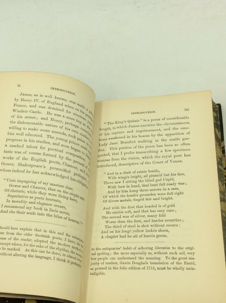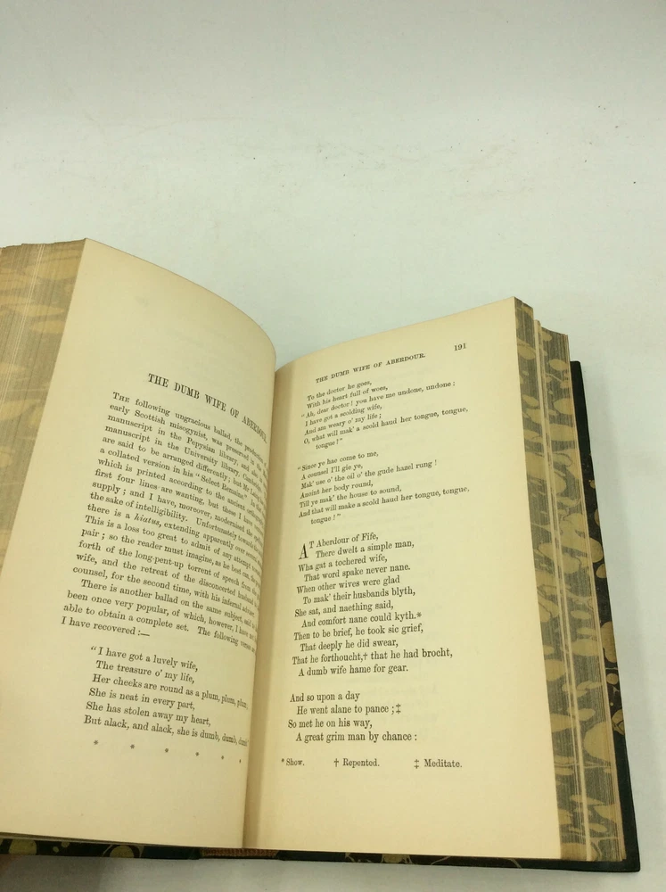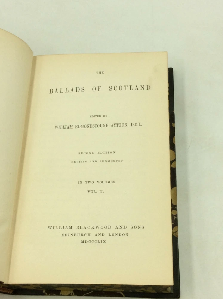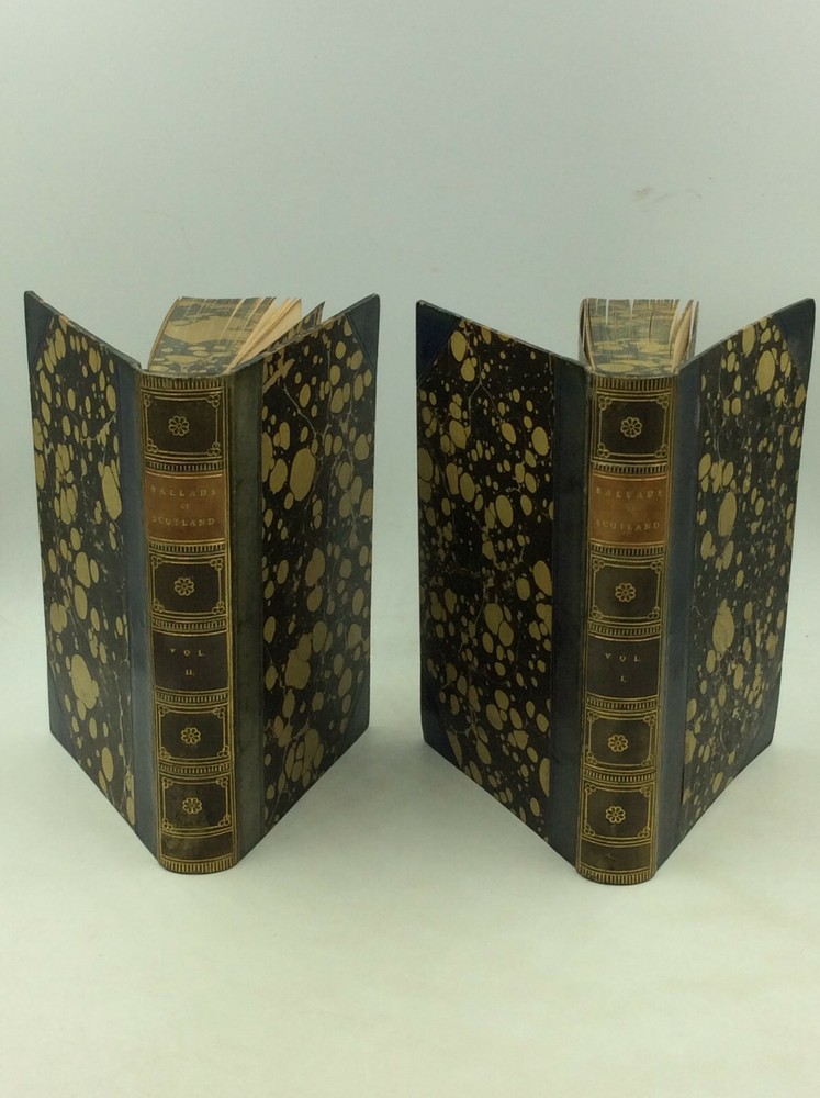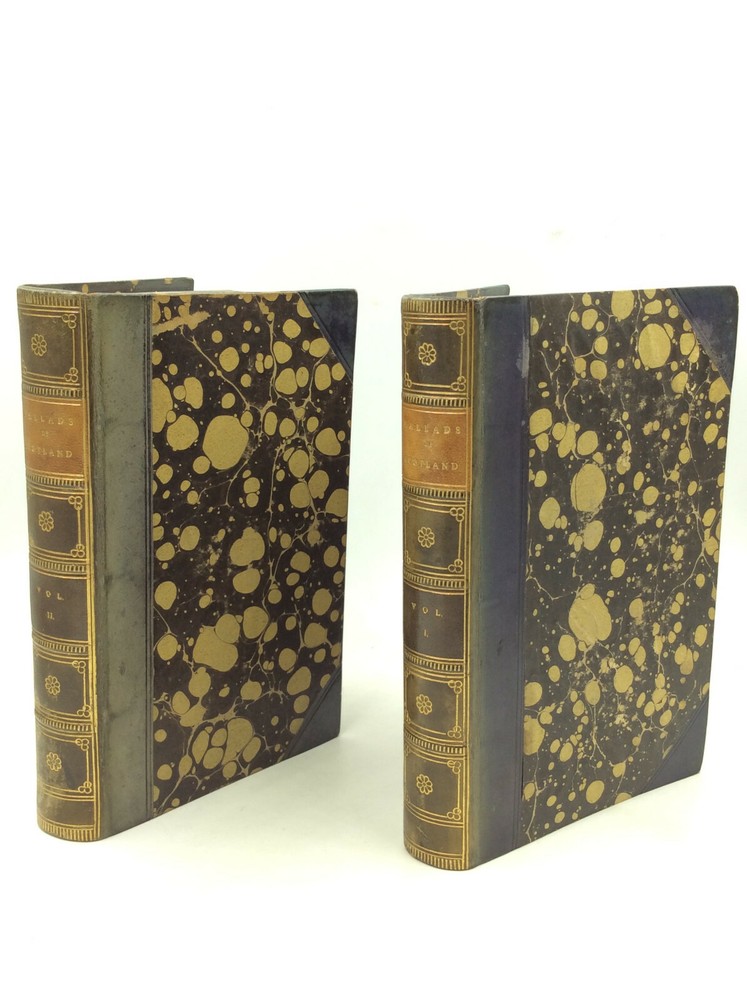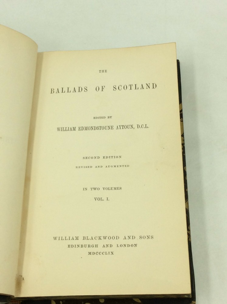 William Edmondstoune Aytoun, ed. THE BALLADS OF SCOTLAND, Volumes I-II Edinburgh/London: William Blackwood and Sons, 1859. Second Edition. Leather. 2 vols. 296p; 403p. A set of two hardcover books bound in 3/4 dark blue leather with marbled boards, foredges, and endpapers. The spines are sunfaded (a bit more severely on volume II) and the corners lightly rubbed. Early owner's flourishing pencil inscription on a blank front endpaper in volume I. Otherwise, pages clean and binding tight. Item #176944 A handsome two-volume collection of Scottish poetry.