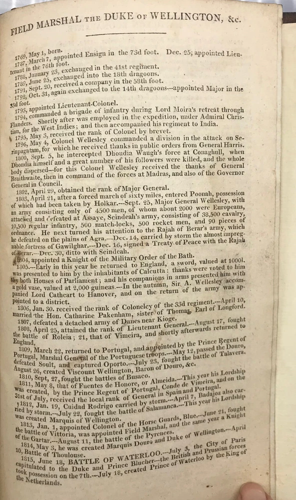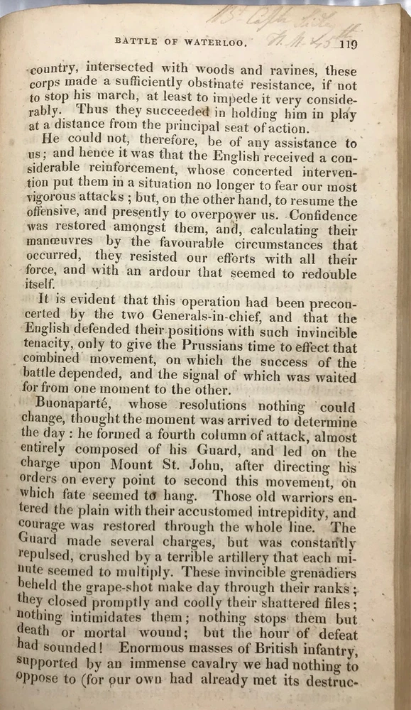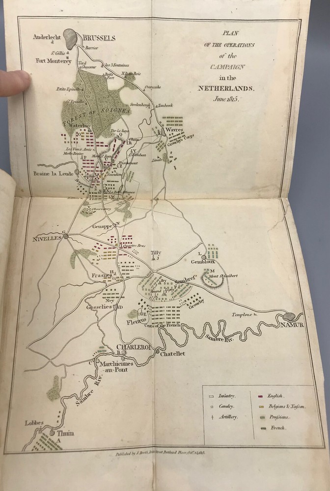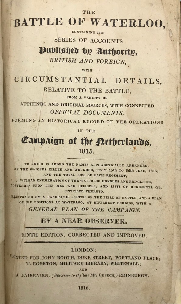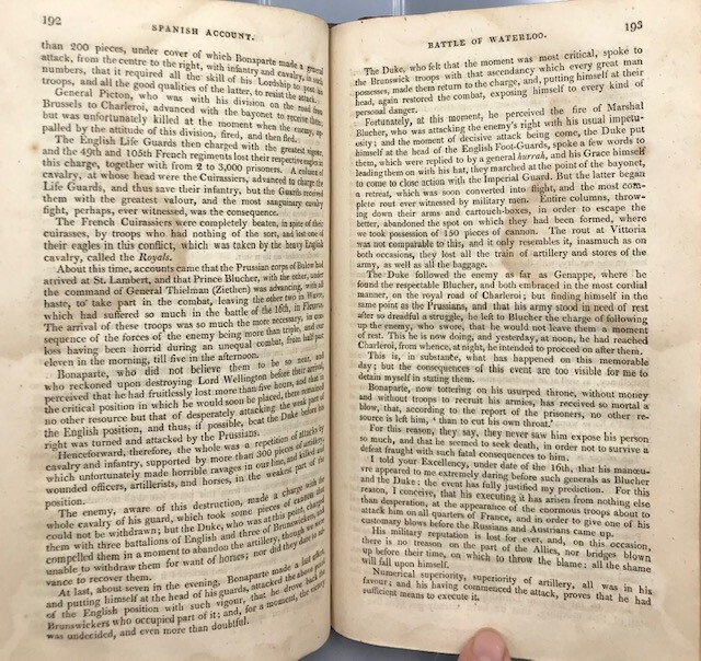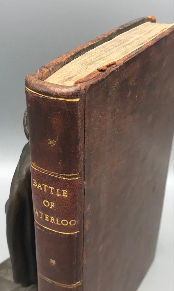 THE BATTLE OF WATERLOO, CONTAINING ACCOUNTS ETC. -1816 -Maps [9th ed., complete] THE BATTLE OF WATERLOO, CONTAINING ACCOUNTS ETC. -1816 -Maps [9th ed., complete] The Battle of Waterloo, Containing the Series of Accounts Published by Authority, British and Foreign, etc. with fold-out maps and plates Ninth edition. London: John Booth, T. Egerton & J. Fairbairn, 1816 Hardback is overall in VERY GOOD condition. Leatherbound covers have gilt title and ornament on spine. Boards show some wear, aging, dings, edgewear. Corners are bowed and worn. See photos. Spine has gilt text and is clear; professionally rebacked with firm ends. See photos. Binding is secure. New end papers/ pastedowns show a few pencil marks. See photos. Foldout maps are present. Some wear to folds. Illustrations are bright and clear, two color plates fold out. Interior is gently age-toned throughout, exhibits some staining, as at pp. 192-193; a few pencil notations as at p. 119. See photos. PS2023.1102 282 pages. 5 x 8.25 inches Full title: The Battle of Waterloo, Containing the Series of Accounts Published by Authority, British and Foreign, with Circumstantial Details, Previous, During and After the Battle, from a Variety of Authentic and Original Sources, with Connected Official Documents, Forming an Historical Record of the Operations in the Campaign of the Netherlands, 1815. To which is added the names alphabetically arranged, of the officers killed and wounded, from 15th to 26th June, 1815, and the total loss of each regiment, with an enumeration of the Waterloo honours and privileges, conferred upon the men and officers, and lists of regiments, etc. entitled thereto. Illustrated by a panoramic sketch of the field of battle, and a plan of the positions at Waterloo, at different periods, with a General Plan of the Campaign. By a Near Observer. As the title states, a detailed account of the Battle of Waterloo, drawn from various sources, and paying special attention to the Duke of Wellington and Napoleon. Stated Ninth Edition, corrected and improved. AS IS! Please see photos. More photos available upon request. International first class shipping includes a handling charge to cover insurance. Domestic orders over $250 include a handling charge to cover signature confirmation. #panoplybooks #rarebooks #bookboutique #collectiblebooks #antiquebooks #vintagebooks #bookstore We invite you to view our Shipping & Returns policies , or to contact us with any questions. . Shipping Click to edit content for Shipping