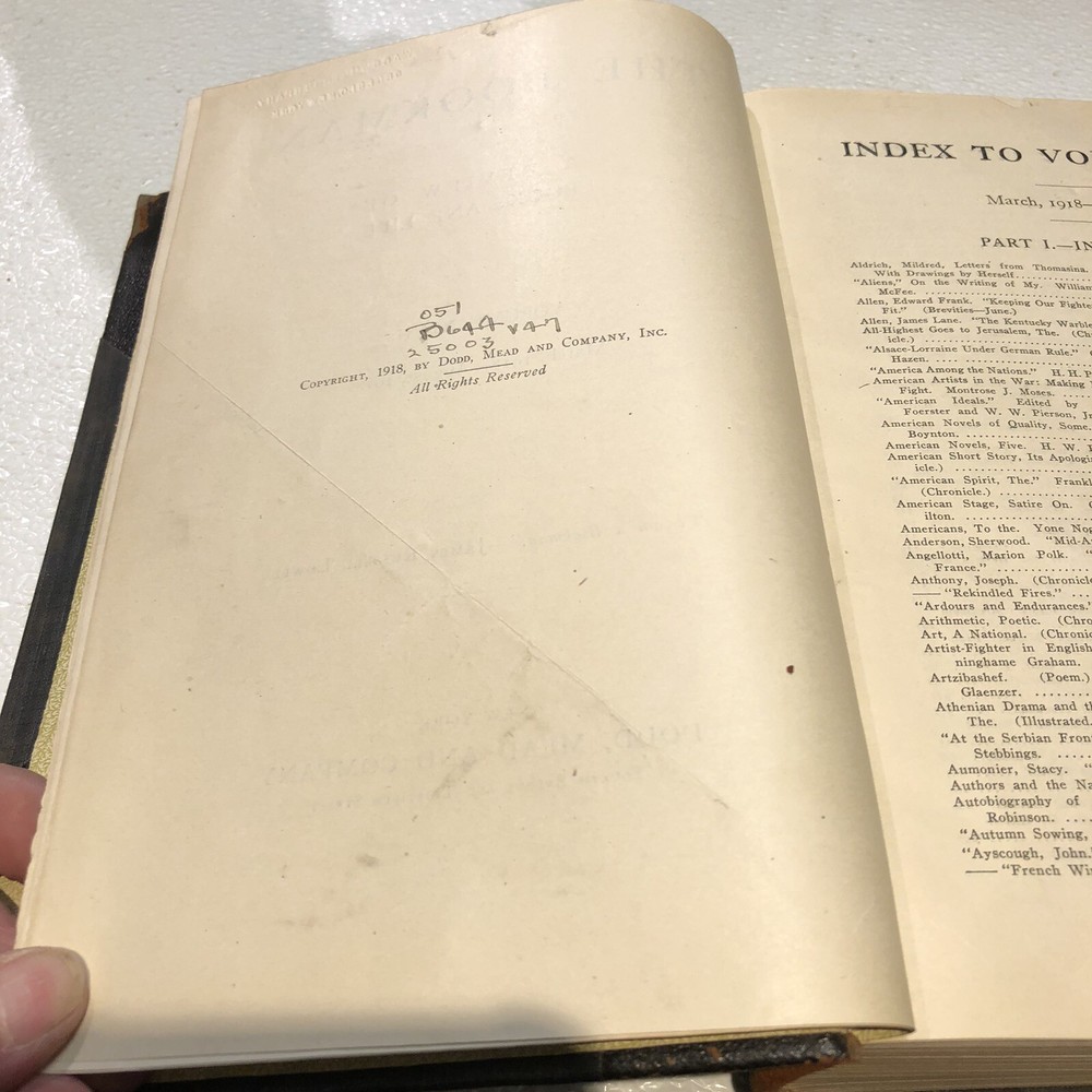 This is a rare and unique edition of "THE BOOKMAN: A Review of Books and Life, VOL XLVII / 47 March 1918-August 1918". The leather & cloth binding is exquisite and adds to the charm of this antique piece. The book is written in English and published by Dodd, Mead & Co. in 1918, making it a valuable addition to any literature lover's collection. It covers a wide range of topics and is classified under the categories of Books & Magazines and Antiquarian & Collectible. This edition is a true testament to the beauty and importance of literature from the past. See photos