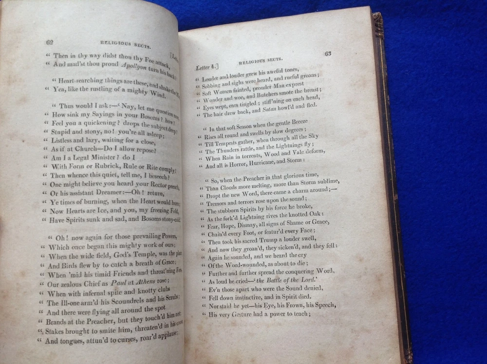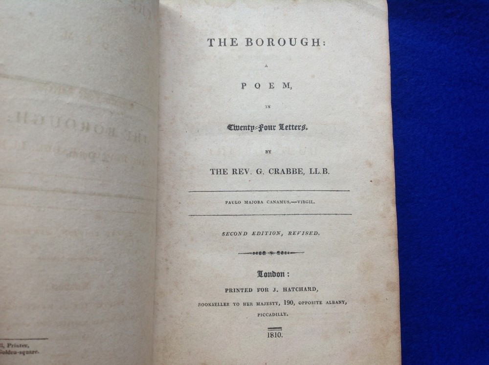 The Borough is a collection of poems by George Crabbe in 1810. Written in heroic couplets the poems are arranged as a series of 24 letters, covering various aspects of borough life and detailing the stories of certain inhabitants’ lives. Of the letters, the best known is that of Peter Grimes in Letter XXII, which formed the basis for Benjamin Britten’s opera of the same name. Letter XXI describes Abel Keene, a village schoolmaster and then a merchant's clerk who was led astray, lost his place and finally hanged himself. The poem was begun in 1804, three years before the publication of The Parish Register , and demonstrates a clear development in Crabbe’s writing between the pastoral concerns shown in The Village, and the concentration on the life stories of individuals as seen in the Tales . Overall in good condition for its age. See condition, above. Leather bound, 347 pages. Incredibly rare.
