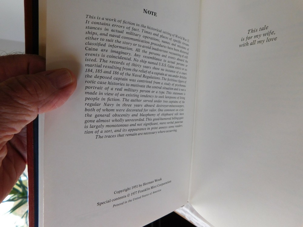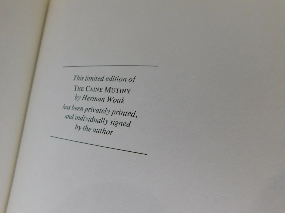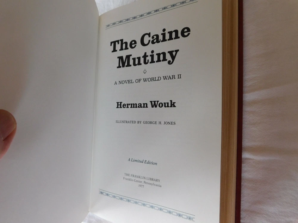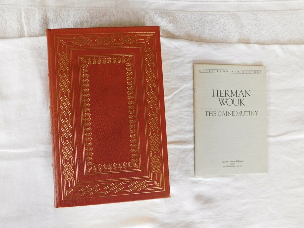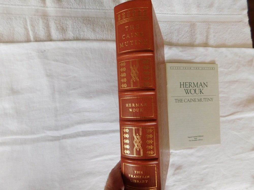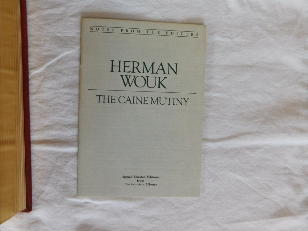 THE CAINE MUTINY by Herman Wouk- Franklin Library Limited Edition *SIGNED*. FRANKLIN LIBRARY 60 Series ... Leather Hardback with Gold Edging and Attached Ribbon Book Mark INCLUDES: “Notes From The Editors” booklet Protective Tissue Guard for Author’s Signature Page CONDITION: Very Good- Appears Unread. Note: I only partially opened the book to take pictures very carefully- This book was purchased, put on a bookshelf for display with others and never read. Shipping is via USPS Media Mail in a Book Box, Wrapped, Sealed and Taped A RARE BEAUTIFUL BOOK WITH EXQUISITE ILLUSTRATIONS - PERFECT FOR THAT GIFT THAT WILL LAST FOR GENERATIONS TO ENJOY!