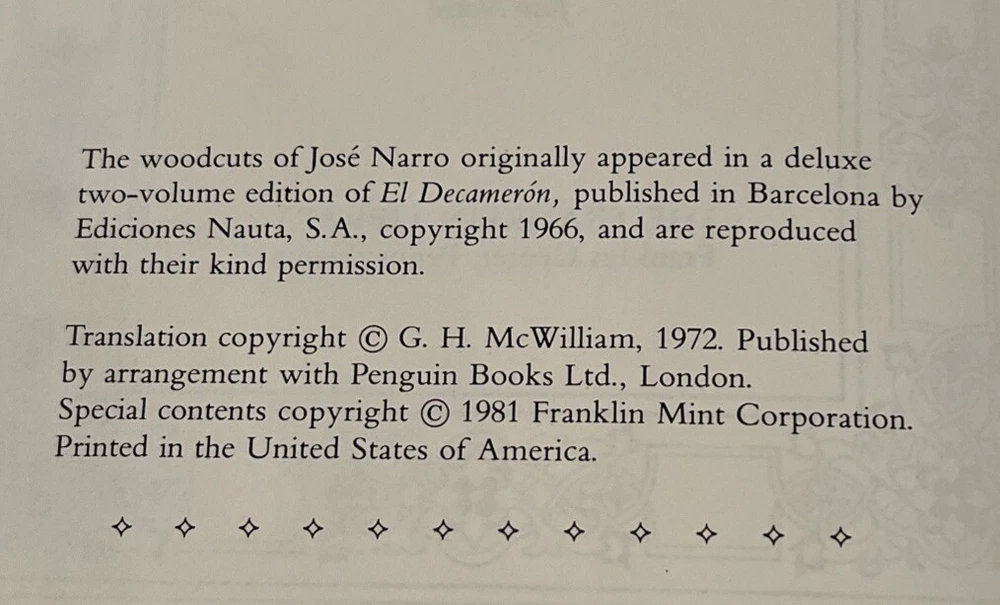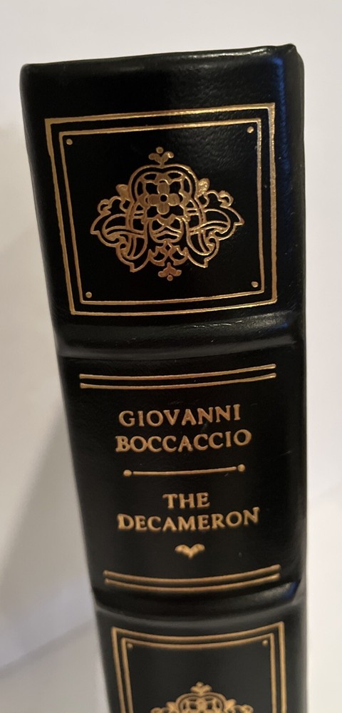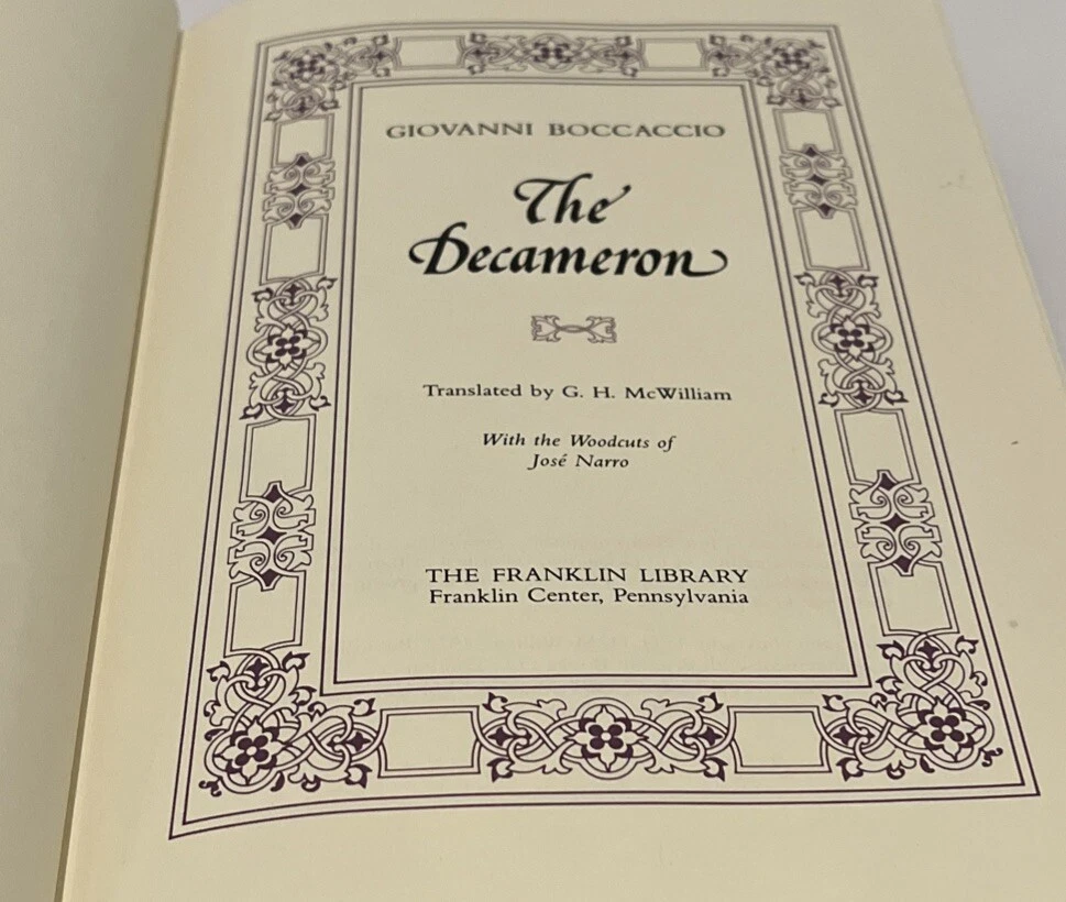 Delve into the richness of Italian Renaissance literature with THE DECAMERON by Giovanni Boccaccio, presented in a luxurious 1/4 leather collector's edition by Franklin Library, printed in 1981. This classic work of fiction is beautifully bound with Jose Narro's illustrations enhancing the reading experience, and it's a treasure for any lover of literature and fiction. Published in Pennsylvania, United States, this original edition adds to its allure. It's a must-have for collectors and enthusiasts of North American literature, offering a glimpse into the storytelling tradition of the region. The book is in English and is a testament to the enduring appeal of classical narratives.