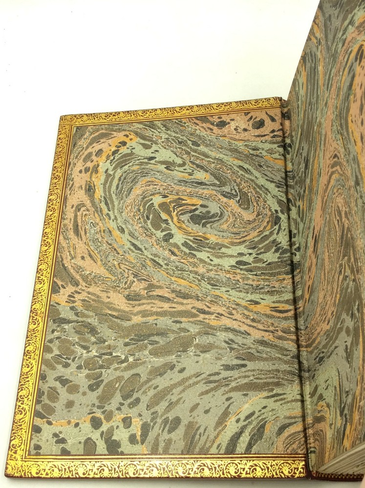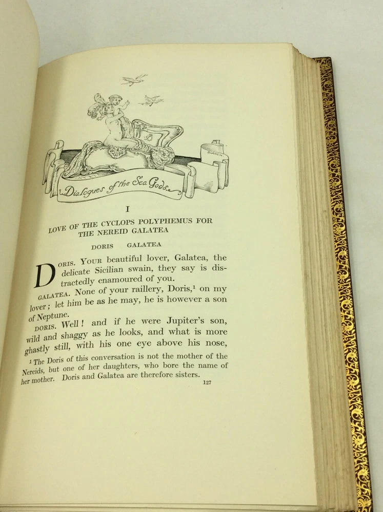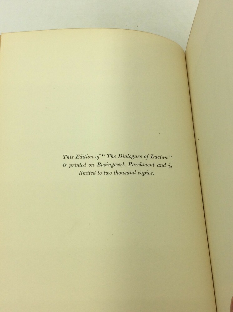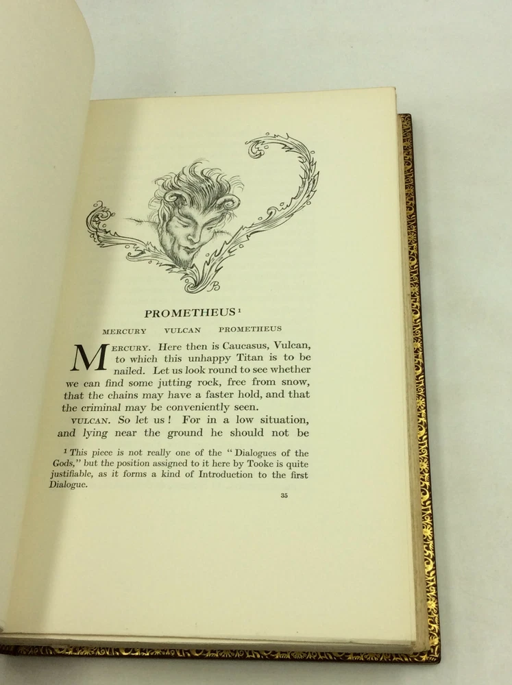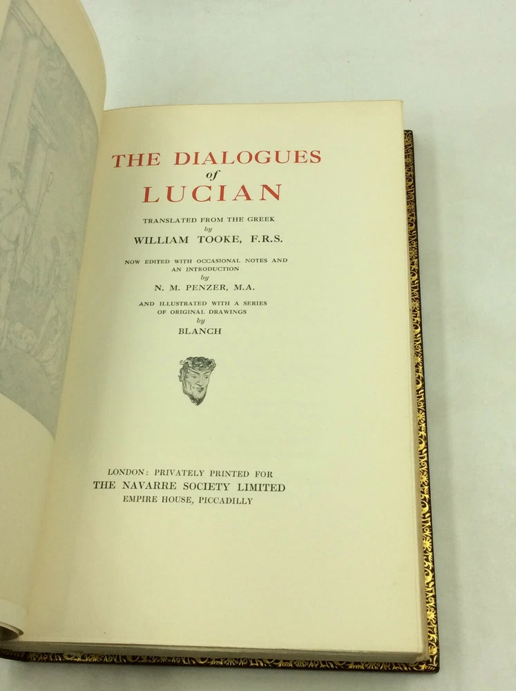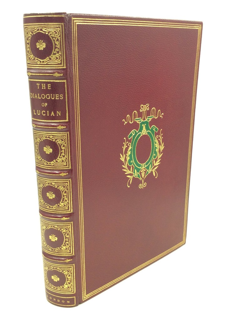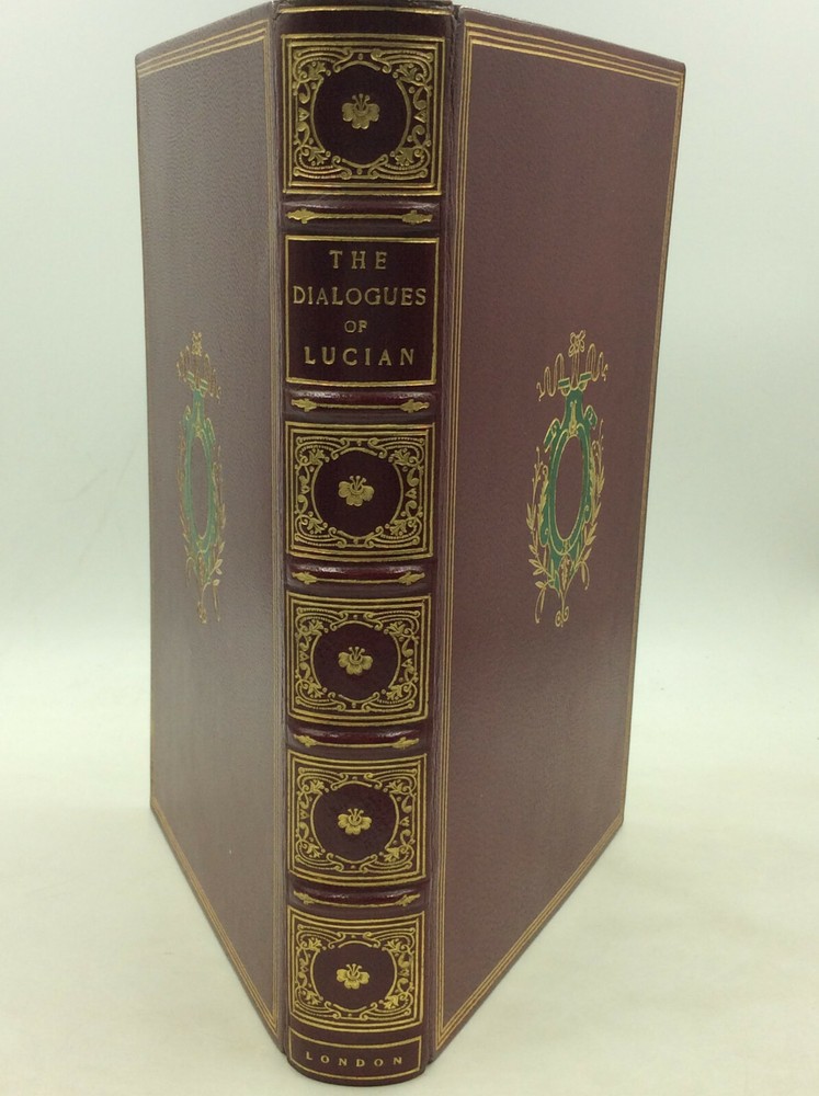 William Tooke, trans. THE DIALOGUES OF LUCIAN London: The Navarre Society Limited. Leather. 310p. FINE BINDING FROM THE HARCOURT BINDERY. LIMITED EDITION; ONE OF 2,000 COPIES. A hardcover book attractively bound in full red leather with ornate gilt decorations and five raised bands on the spine. Features a gilt top edges, gilt dentelles, marbled endpapers, and decorative embelms on the front and back boards. The edges of the free endpapers are tanned, but otherwise, the pages are clean, bright, and smooth. The binding is tight and the covers pristine. A beautiful, collectible copy in fine condition! Item #177117 Edited by N.M. Penzer and illustrated with black and white plates by Blanch. Undated; ca. early 1900s.