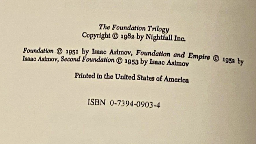 ULTRA RARE 50TH ANNIVERSARY COPY OF THE FOUNDATION TRILOGY SPECIAL 1982 NIGHTFALL PRESS EDITION BY ISAAC ASIMOV PLUSH PADDED LEATHER, GOLD GILT PAGE EDGES AND LETTERING.