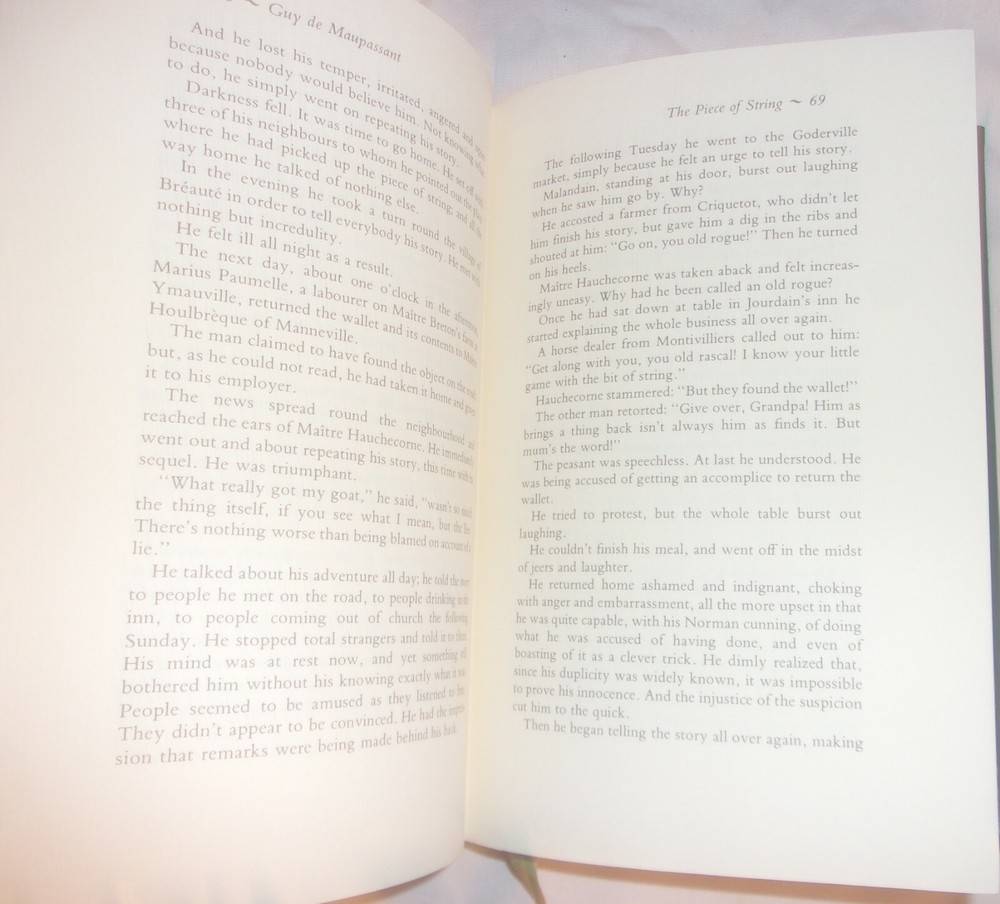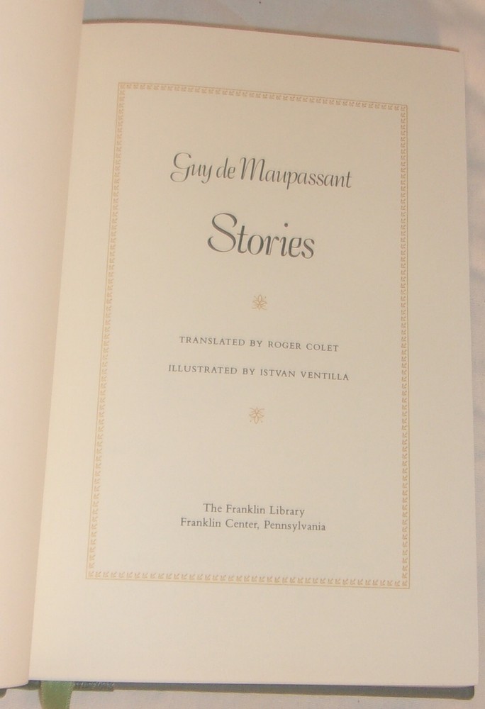 Franklin Library "Stories" by Guy De Maupassant, in very good condition.This is a 1983 printing and has a green quarter bound leather cover.The pages look nice inside.A good vintage book to read. Items are sold as is, so please read the item description for the condition of the item.Payment is expected within 3 days of auction end. Please allow USPS shipping rules for item to reach you.Usually within 7-10 days for parcel post or quicker for priority mail.Items are sold as is, please read the item description. Please e-mail me with any questions.Thank you. On Jul-25-14 at 14:26:07 PDT, seller added the following information: Track Page Views With Auctiva's FREE Counter