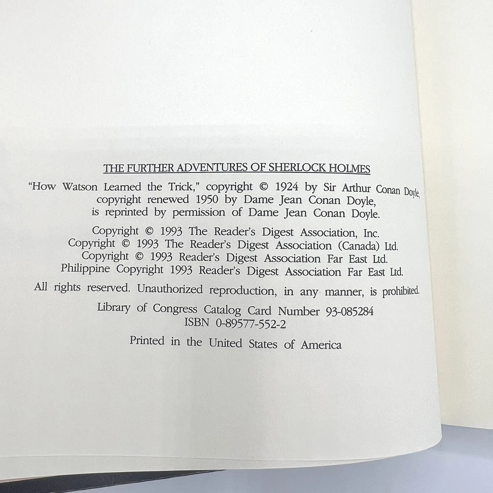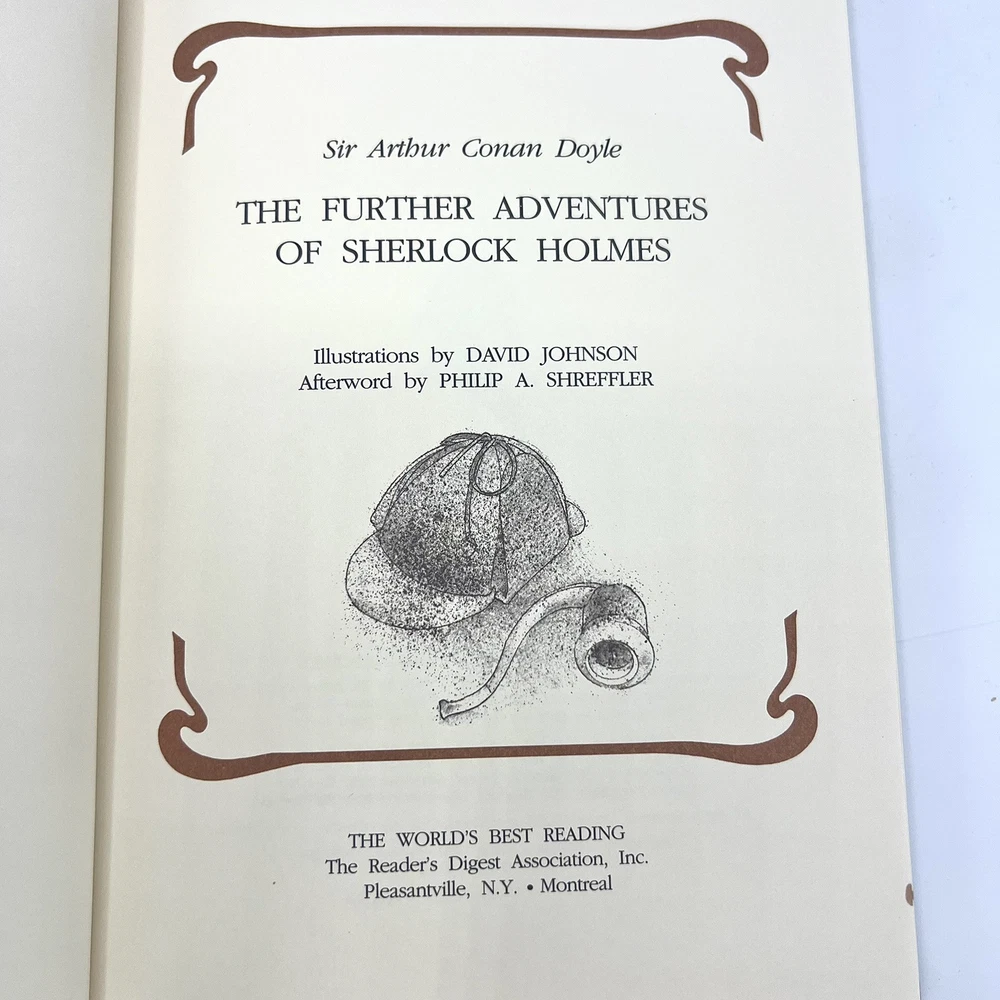 "The Further Adventures of Sherlock Holmes" is a collector's edition novel published by Reader's Digest Association in 1993. Authored by Arthur Conan Doyle, this adventure fiction is part of the Sherlock Holmes series and is intended for young adults and adults. The hardcover book features a faux leather bound cover and contains 219 pages, exploring classic crime and mystery themes in English. Note: has writing in marker on the inside (refer to the photos)