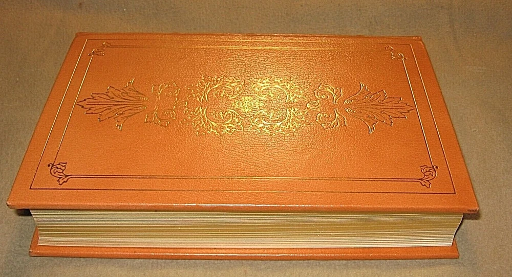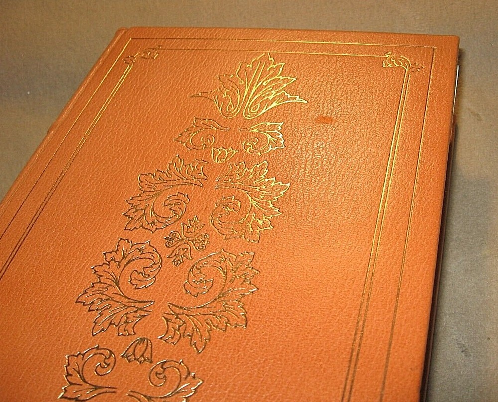 FADING TO EDGES OF END PAPERS. LIGHT SCUFFS AND WEAR TO THE GOLD GILT EDGES . BOOK MARK WAS INCORRECTLY FOLDED AT EDGE. SMALL SPOT TO FRONT COVER WHERE LEATHER WAS SCUFFED ( PHOTO 5) LIGHT SOILING TO EDGES OF LEATHER. PLEASE USE ZOOM FUNCTION TO INSPECT ALL PHOTOS 123bag