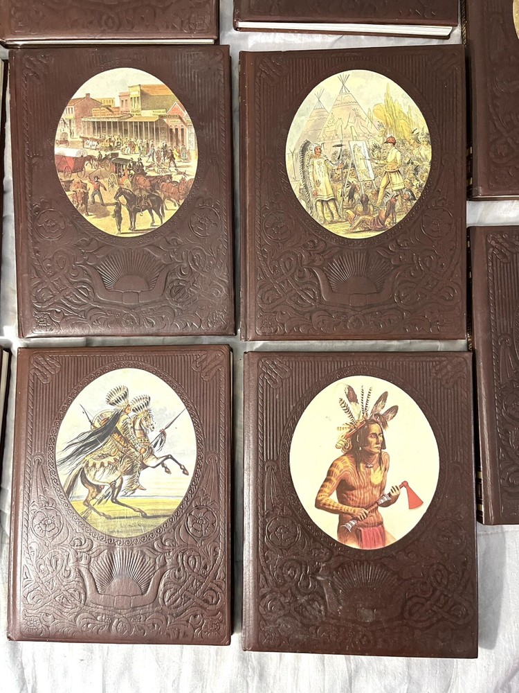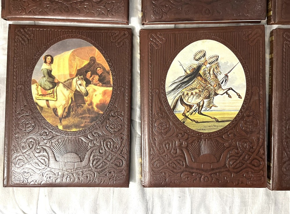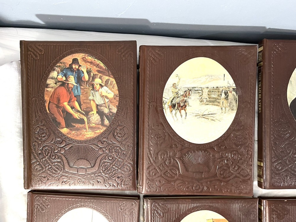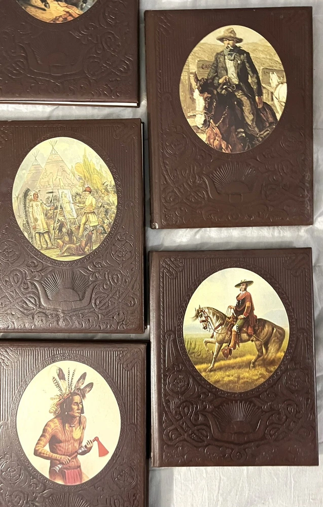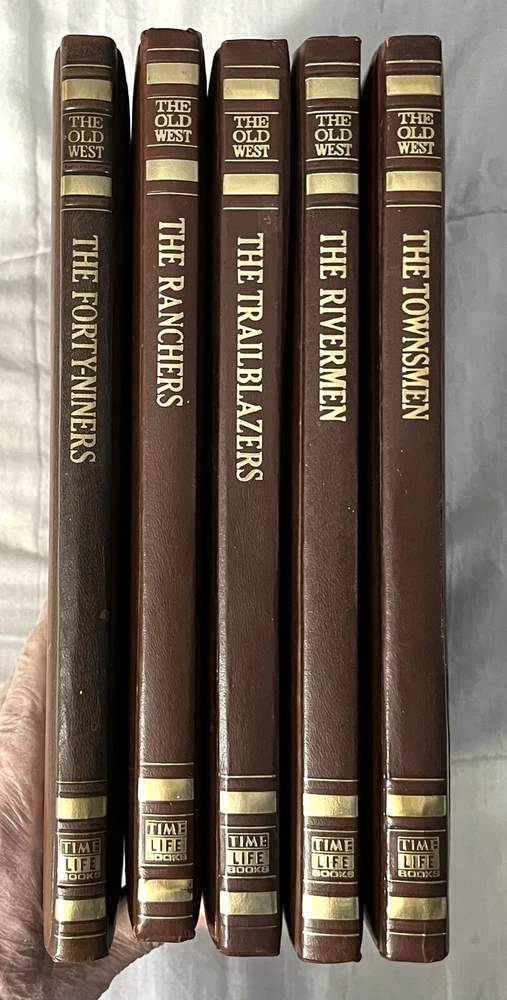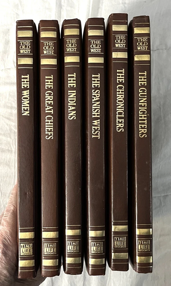 11 Very good condition hardcover books. About 11” tall. Early 1970s publications. Exterior: Leatherette bindings are clean, square, and tight. No wear of the corners. Interior: Two of the books (The Gunfighters and The Great Chiefs) have owner name handwritten in large ink script on the front free endpapers…see photos. Pages are clean with no tears, creasing, or other handwriting. Titles follow: The Gunfighters The Great Chiefs The Ranchers The Rivermen The Women The Indians The Spanish West The Chroniclers The Townsmen The Trailblazers The Forty-Niners