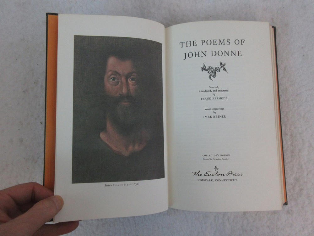 THE POEMS OF JOHN DONNE Selected, introduced, and annotated by Frank Kermode Wood Engravings by Imre Reiner The 100 Greatest Books Ever Written The Easton Press, 1979 A Leather Hardcover in Near Fine Condition. Please examine photos for details. Condition: We strive to describe and photograph the condition of every item as accurately as possible. Photos are of the actual item that is being sold. Please examine the photos carefully for any condition details and possible flaws. Best Offers: Items are available for offers only after being listed for 30 days. We consider all offers in relation to current market values. We try to respond almost immediately to most offers. Most of our counteroffers are firm but we are open to bargaining. Shipping for US Customers: We combine shipping. When ordering multiple items from us please request a total before paying. We charge postage based on weight plus $1 for each eBay listing. All of our orders are packed carefully to prevent damage during shipment. We ship most of our items within 24 hours. Shipping for International Customers: All international orders are shipped via Ebay's Global Shipping Program. Please contact us first before ordering multiple items to save on shipping charges. Contact Us: We are available 7 days a week and are happy to answer any questions you may have. 300+ Listing Templates! Auctiva gets you noticed! The complete eBay Selling Solution.