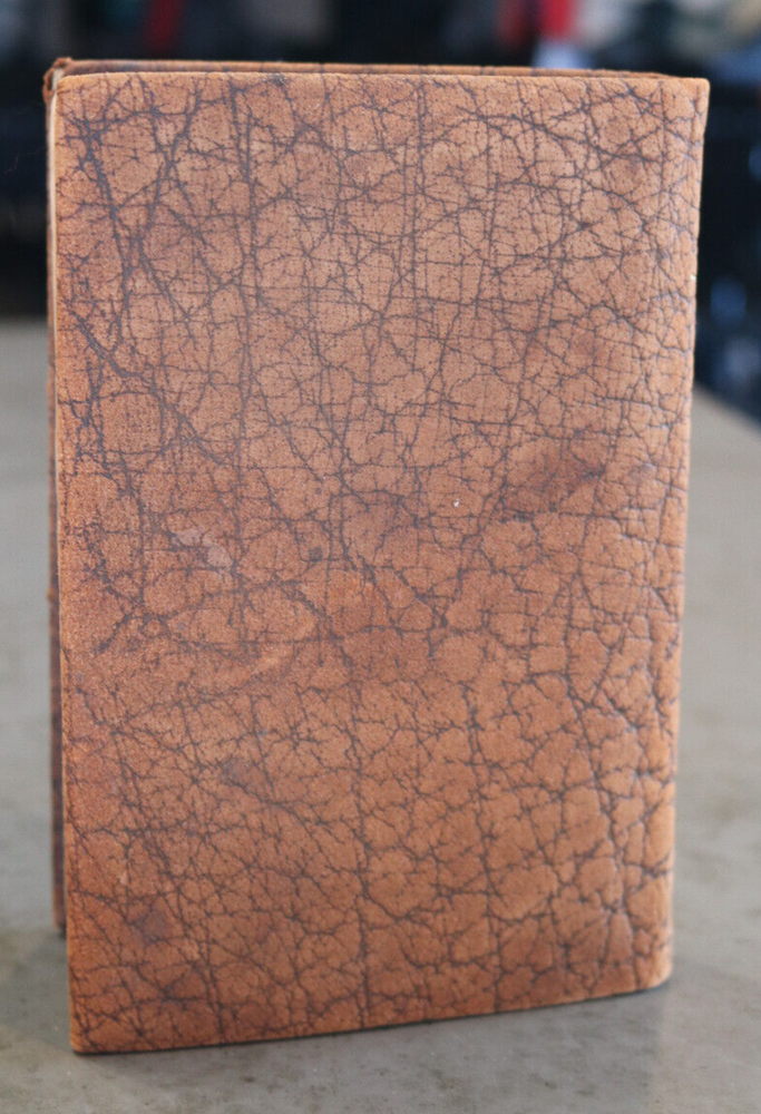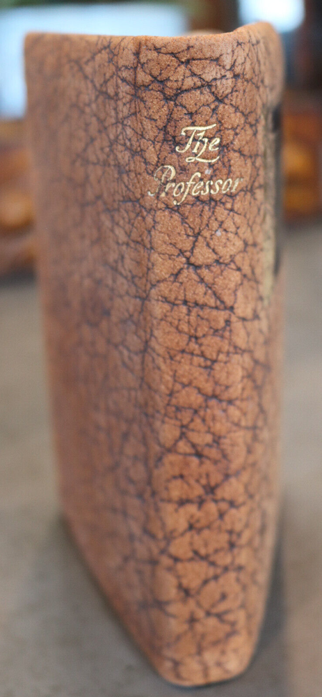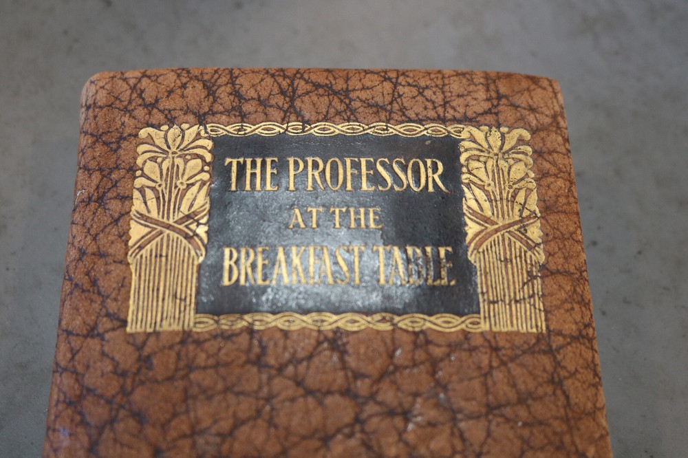 1902 edition of Oliver Wendell Holmes' "The Professor at the Breakfast Table". This story originally appeared in 1859 in The Atlantic Monthly. This edition is in very good antique condition. The binding is intact. The cover appears and feels like suede, although I can't be sure. I don't know why they would have bound it in anything other than leather. Book measures 6-1/2" x 4-1/2". I can't say it's in pristine condition, as there are some pages with tears and water marks/stains. But it's a fine book for its age. Introduction by Richard Burton (no, not THAT Richard Burton). The inside front cover shows the various owners of the book from 1909 through 2009.