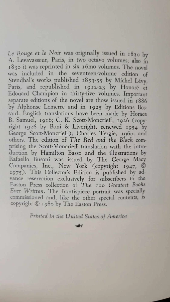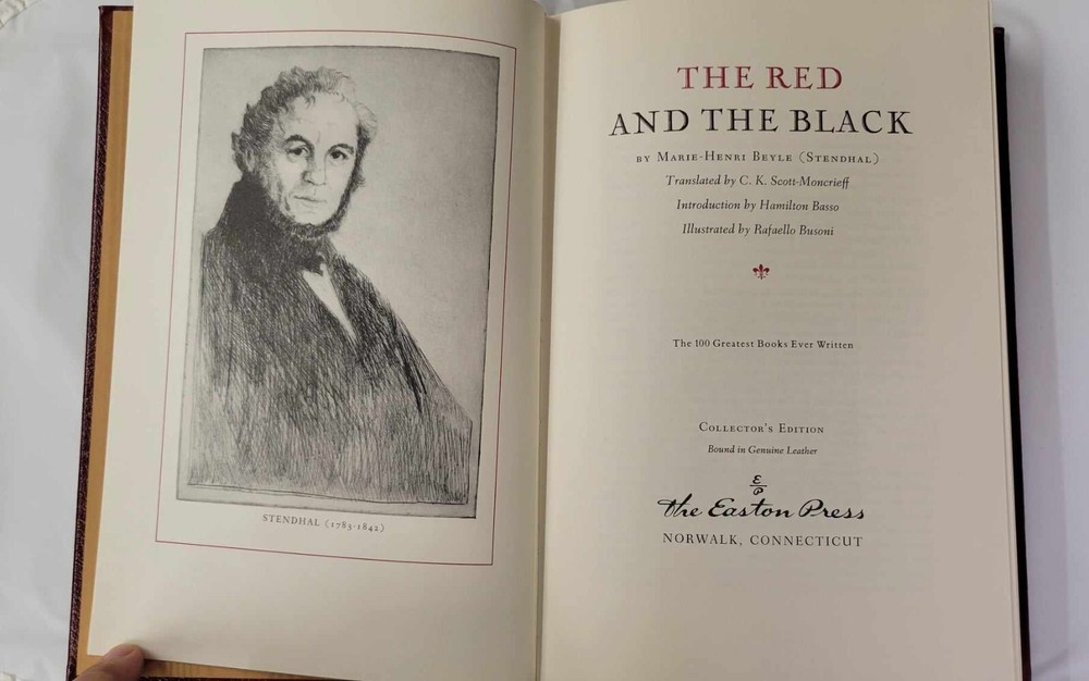 THE RED AND THE BLACK BY MARIE-HENRI BEYLE STENDHAL 1980 EASTON PRESS. Like New Fine, Leather Bound. Book accented in 22kt gold. Printed on archival paper with gilded edges. The endsheets are of moire fabric with a silk ribbon page marker. Smyth sewing and concealed muslin joints to ensure the highest quality binding. This book is in full leather with hubbed spines. ; First Easton Press Edition. ; 8vo 8" - 9" tall.