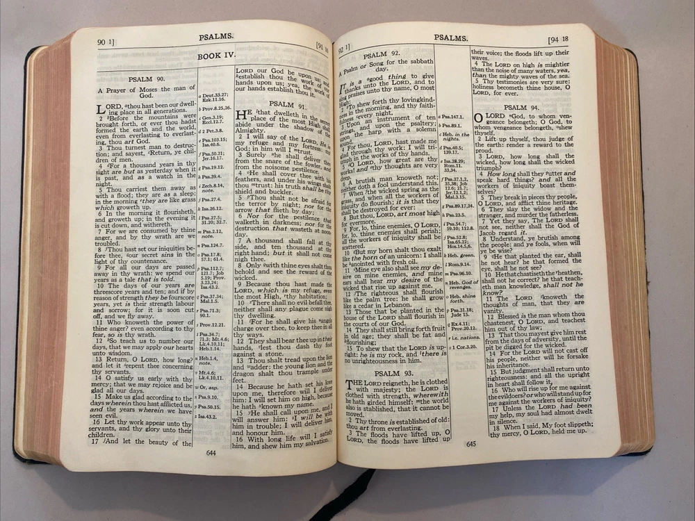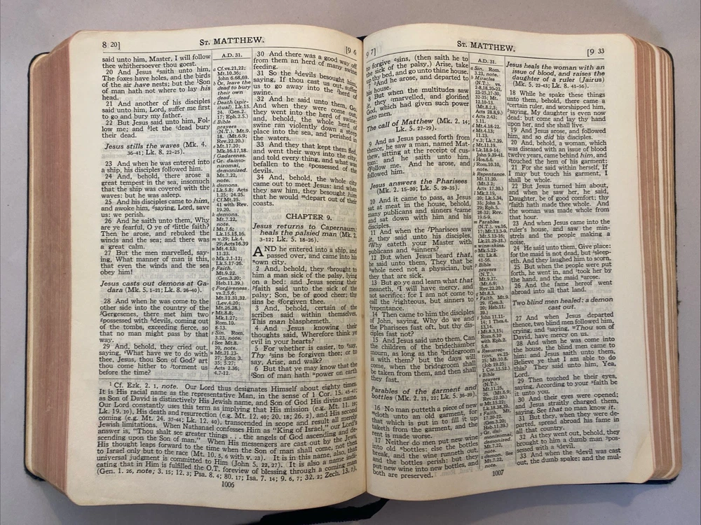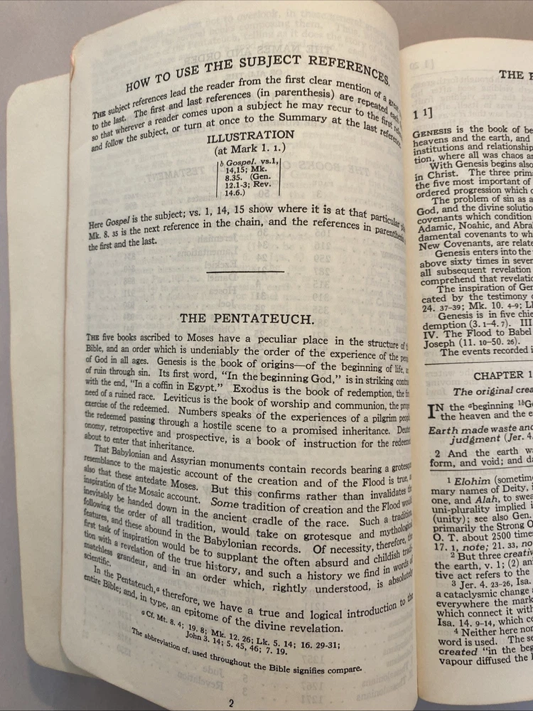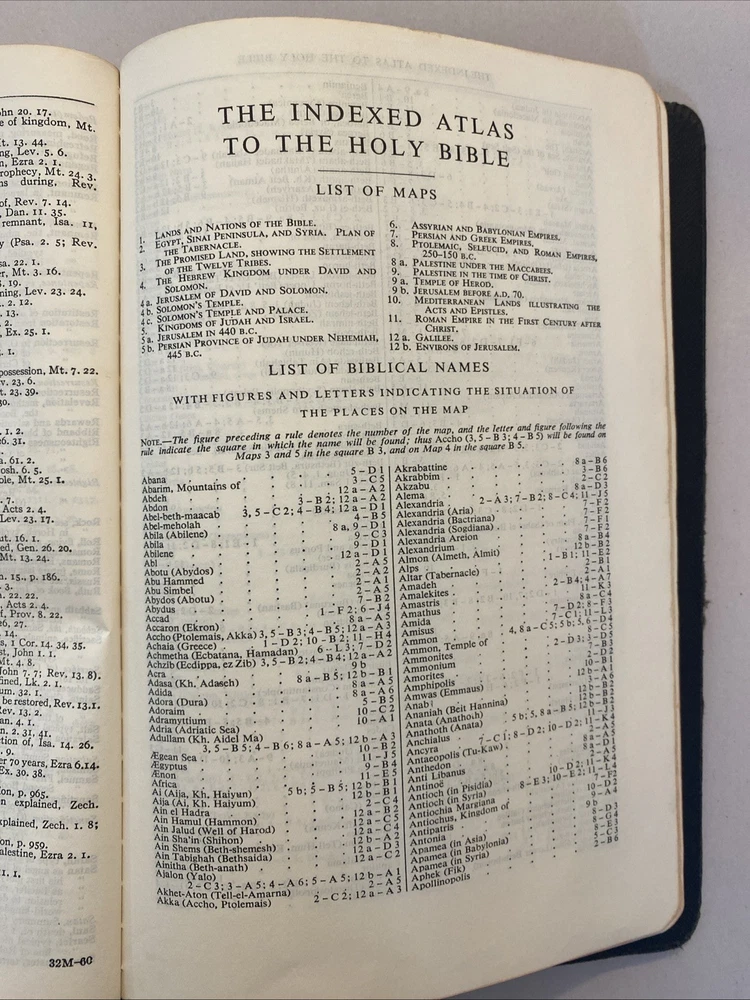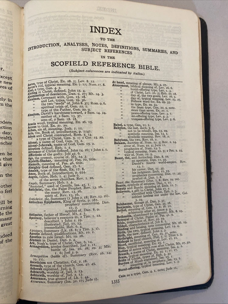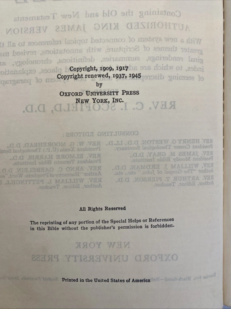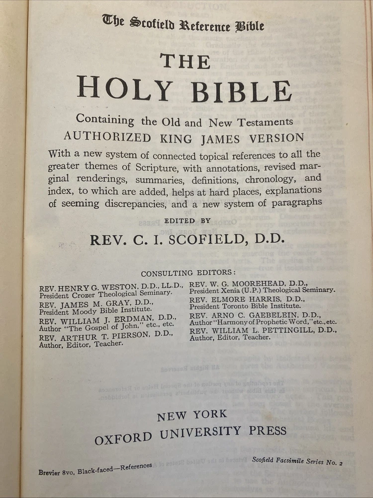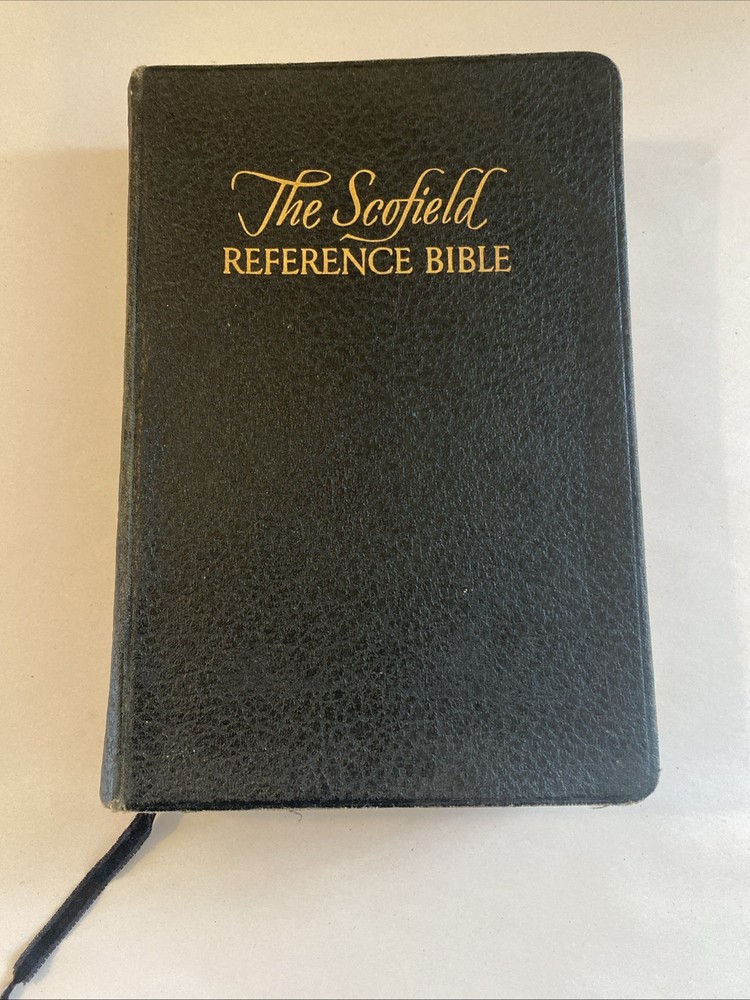 THE SCOFIELD REFERENCE BIBLE, REFERENCE EDITION BIBLE, King James Version. Published by Oxford University Press, 1945, with a print date of 1961. Brevier 8vo, Black-faced - References. Scofield Facsimile Series No. 2. Center-column references. Index and Indexed Atlas to the Holy Bible. Color maps. The condition is good or better. There are no names or markings in the text. Solid binding. Some normal cover and edge wear typically seen in a 64-year-old Bible. There are no smoke odors. Please examine the 18 pictures for additional description. Your Bible will be wrapped in white paper and shipped in a solid box with additional padding.