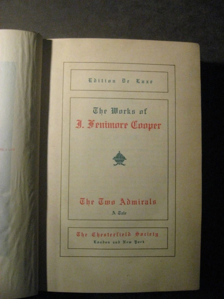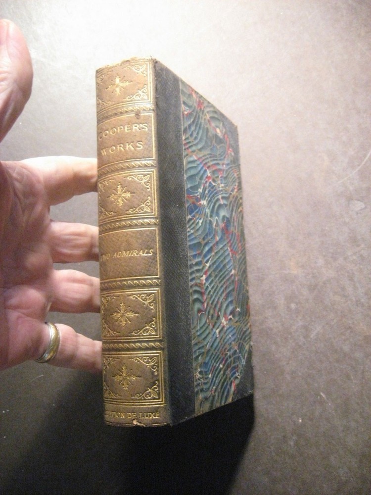 ***************************************************************************************************************************************** THE WORKS OF J. FENIMORE COOPER The Two Admirals, A Tale Published by The Chesterfield Society, London and New York. Edition De Luxe, limited to seven hundred and fifty sets. No copyright; although other books in this set have an 1896 copyright. Good to Very Good Condition hardcover book. Exterior: Attractive. Black leather on spine and corners. Marbled paper on boards. Binding is clean, square, tight. Gilt lettering and ornamentation on faded leather spine. Panel edges and corners are rubbed/worn through to boards. Spine ends are worn, chipped. Small rubbed spot in spine back. Interior: Endpapers are clean, lightly toned. Book plate on first free page (Ella Shipman). Pages are clean, smooth, lightly toned. Top outside edges of pages are good condition gilt. No underlining/highlighting of text or handwriting of any kind. Illustrated with frontispiece with protective tissue (b/w artwork, sailing ship, by Burns). 532 pages. Contents: Classic early American literature by legendary story teller, Cooper (1789-1851). Nautical adventure. NOTE: I only use photos of the actual item I'm selling (no stock photos). I combine shipping. Each additional book/CD/DVD set is $1.00 added to the media rate shipping cost of the heaviest book/CD/DVD set. This policy does not apply to sets of books. I will reduce the shipping cost as much as possible when you buy a set of books plus other book items. Winning bidder pays (Go to the SHIPPING CALCULATOR for this item). New York State residents pay 8% tax. Next day shipping with Paypal (which is easy to sign up for and no extra cost to the buyer). Payment to be received within 10 days. REFUND POLICY: A REFUND OF YOUR PURCHASE PRICE WILL BE GLADLY GIVEN FOR ANY ITEM WHEN RETURNED IN THE SAME CONDITION AS WHEN SENT.