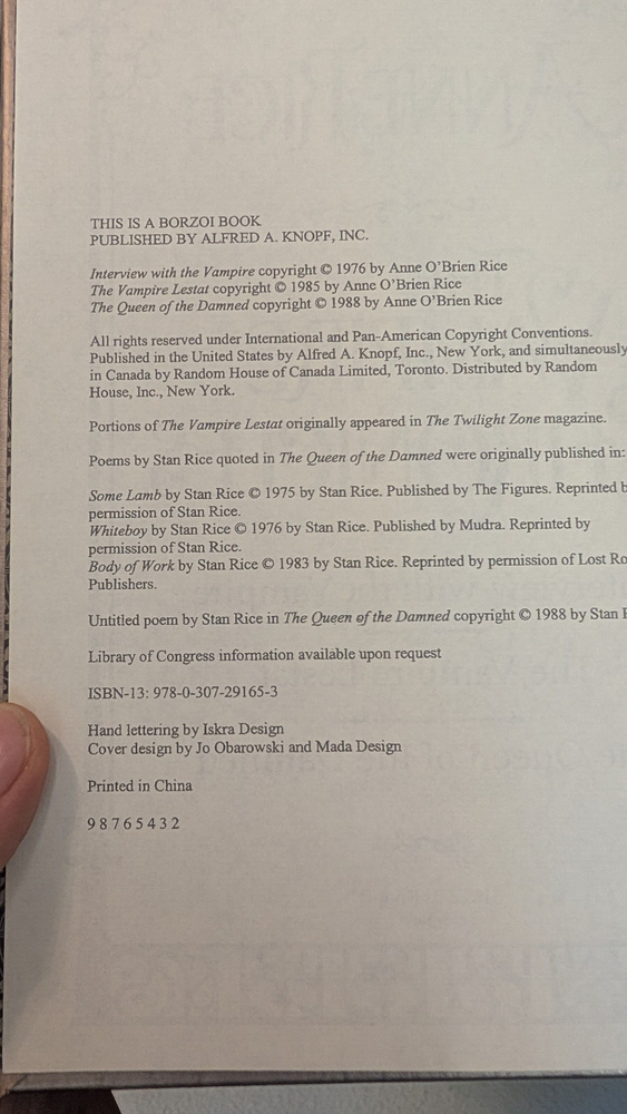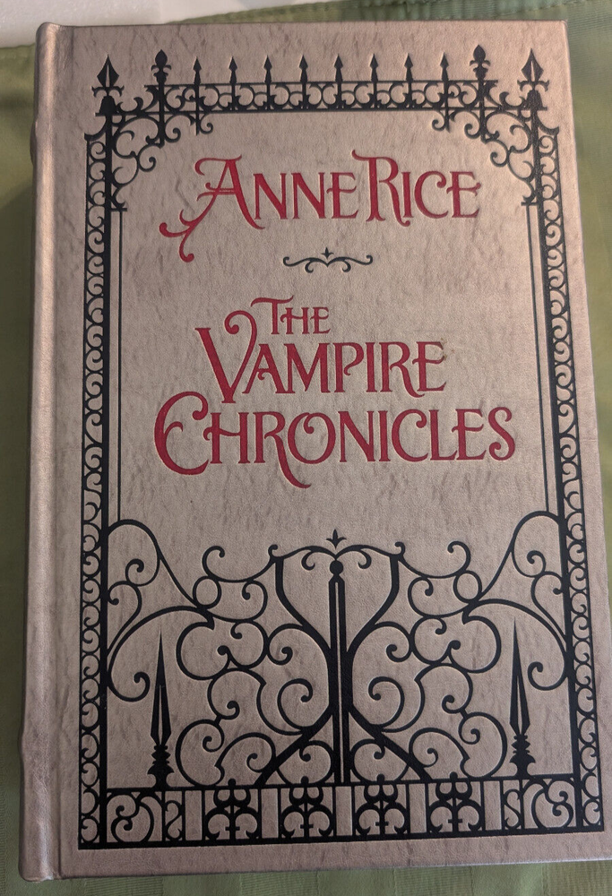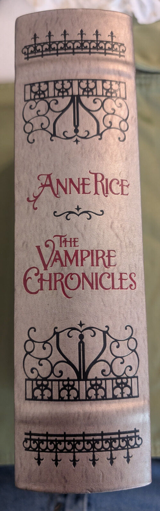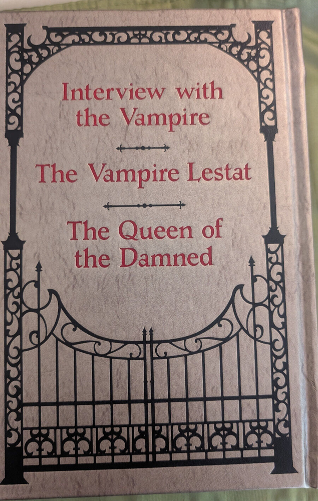 Anne Rice's The Vampire Chronicles in a leather bound volume with gold leaf paper. Includes: Interview with the Vampire, The Vampire Lestat, and The Queen of the Damned. If you have questions or would like additional pictures please let me know.