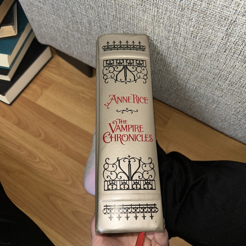 "The Vampire Chronicles" by Anne Rice is a luxury edition of the novel, published in 1988 by Alfred A. Knopf. This leather-bound book is part of a series that falls under the genres of adventure, horror, fantasy, folklore & mythology, and world literature & classics. The narrative, aimed at young adults and adults, explores themes of fasting, literature, ships, vampires, poetry, and books. Written in English, this fiction book delves into the world of vampire folklore and myth, captivating readers with its intriguing storyline and compelling characters."