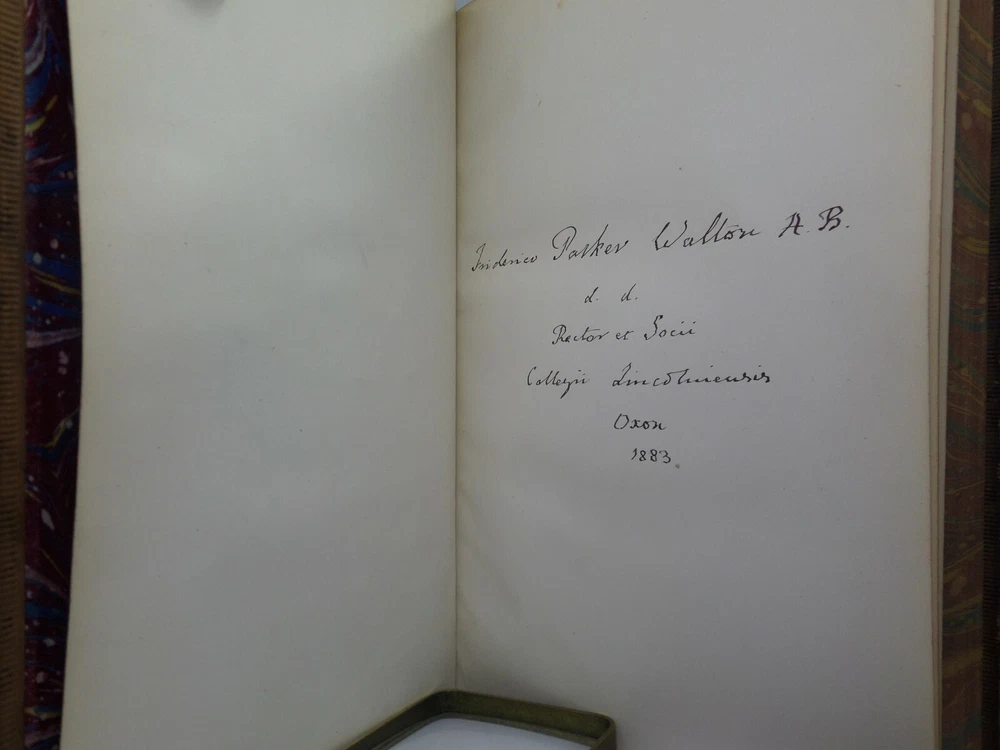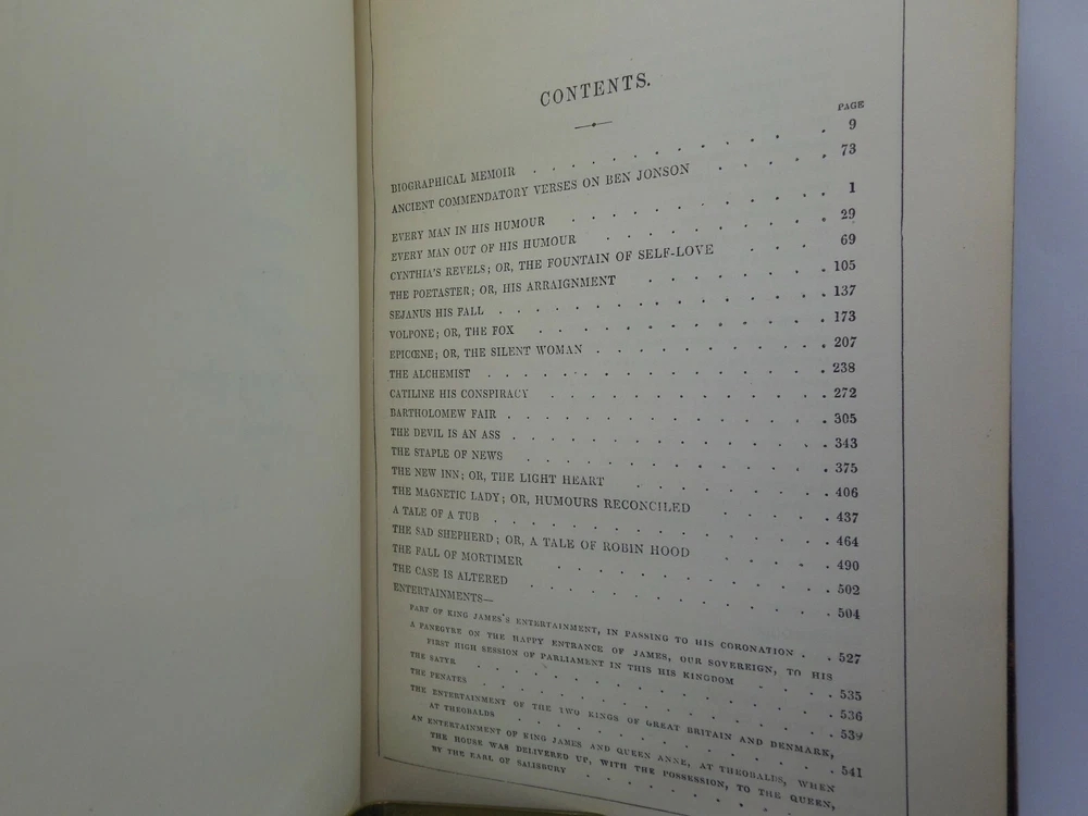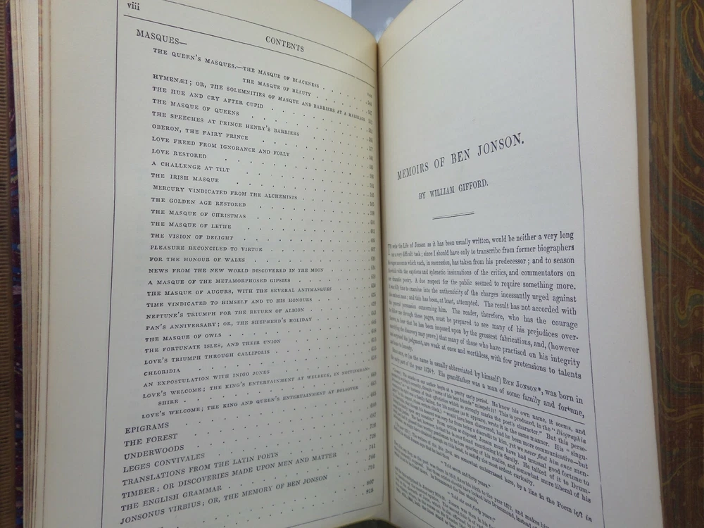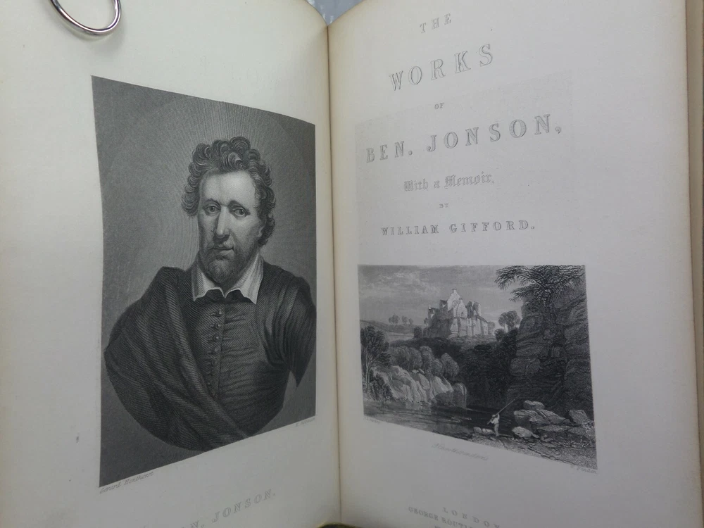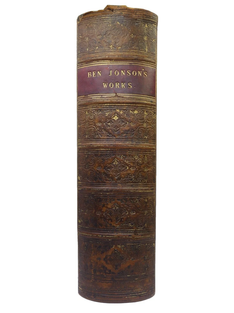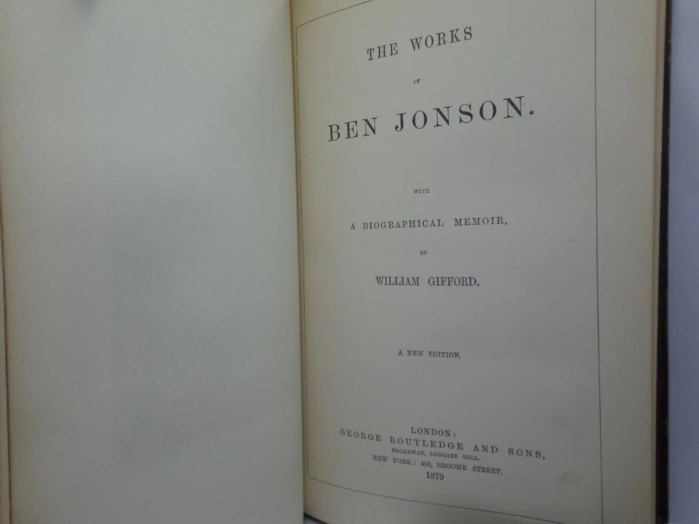 [JONSON, BEN]. The Works. With a Biographical Memoir by William Gifford London: George Routledge and Sons, 1879 . A new edition. Leather-bound. Hardcover. Thick octavo (240 x 160 x 70 mm.). Pp. viii, 813, [5 - index]. English text in double columns. Handsome contemporary full calf , spine and covers gilt, morocco lettering-piece in second compartment, m arbled page edges and endpapers. Half-title, engraved frontis and eng. title-page. Footnotes. Glossary and index to rear. Printed by Bradbury, Agnew & Co. Condition: Good. Binding tight and secure. Some rubbing to extremities, spine-head and joints. Loss of gilt to spine. Interior fine. Neatly inked inscription to ffep. International tracked shipping, dispatched promptly and securely. Please view my other books.