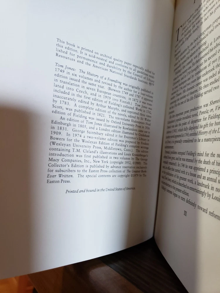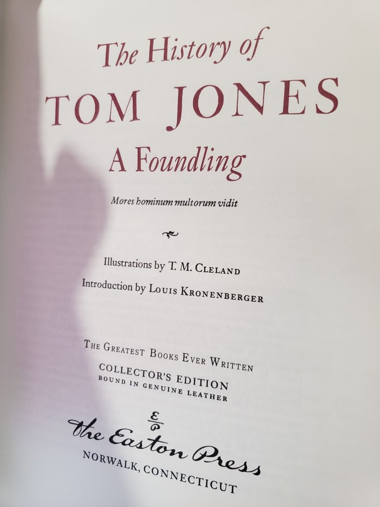 The History of TOM JONES A Foundling Easton Press Leather Henry Fielding Introductions by Louis Kronenberger Illustrated by T. M. Cleland Collector's Edition In Like New, Unread, Near Mint Condition The Greatest Books Ever Written Books Measure 10 1/8" x 6 3/4" Cover is Brown with Gold Lettering BOOKENDS NOT INCLUDED! Always check out photos for more info on details I AM NOT A PHOTOGRAPHER! Please check out my other sales. Most items I get came from yard sales, Goodwill/Thrift stores and Auctions. I try to list any flaws I see. I definitely am not perfect. If I miss anything of MAJOR proportions, I will definitely make it right. Please note, all of these items are used unless noted. I like to say · I know a lot about a little · I know a little about a lot · I know Everything about NOTHING!