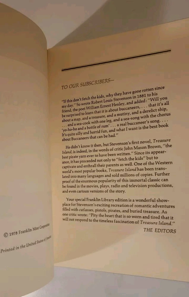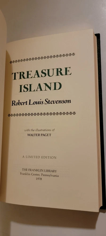 Very very good condition, please look at pictures and ask for more if needed. Book doesn't feel read, very stiff and notes booklet is very crisp, no bent edges. Book does not have a name plate, writing or other marks in it. Feel free to ask if you have any questions and I will do my best to answer. AI description below. This is a rare and collectible edition of "Treasure Island" by Robert Louis Stevenson, published by Franklin Library. The leather bound book features annotations and notes by the editors, making it a unique and valuable addition to any literature collection. The book is in its original form and is written in English. The book's topics include classics and literature & fiction, while the author's name is Robert Louis Stevenson. The publisher is Franklin Library, and the book is categorized under "Best Loved Books" and "Antiquarian & Collectible". This edition is a must-have for any book collector or literature enthusiast.